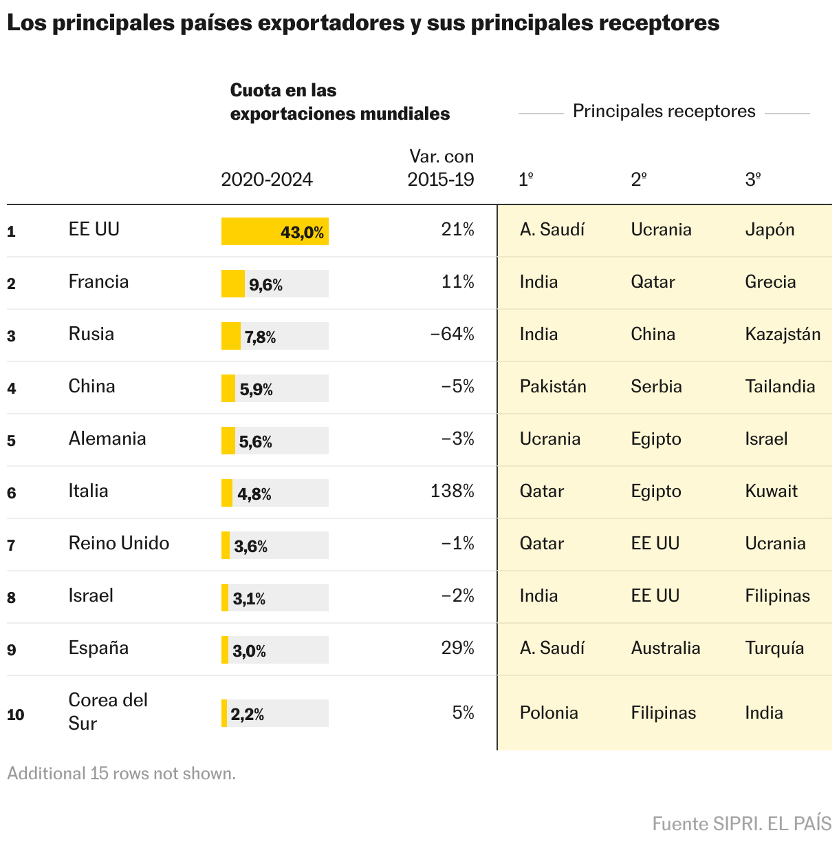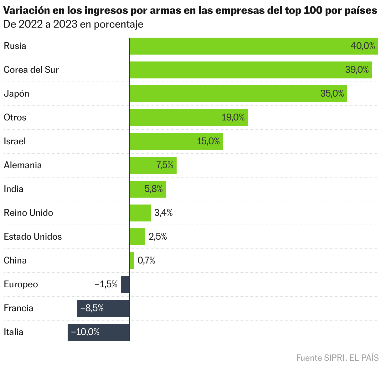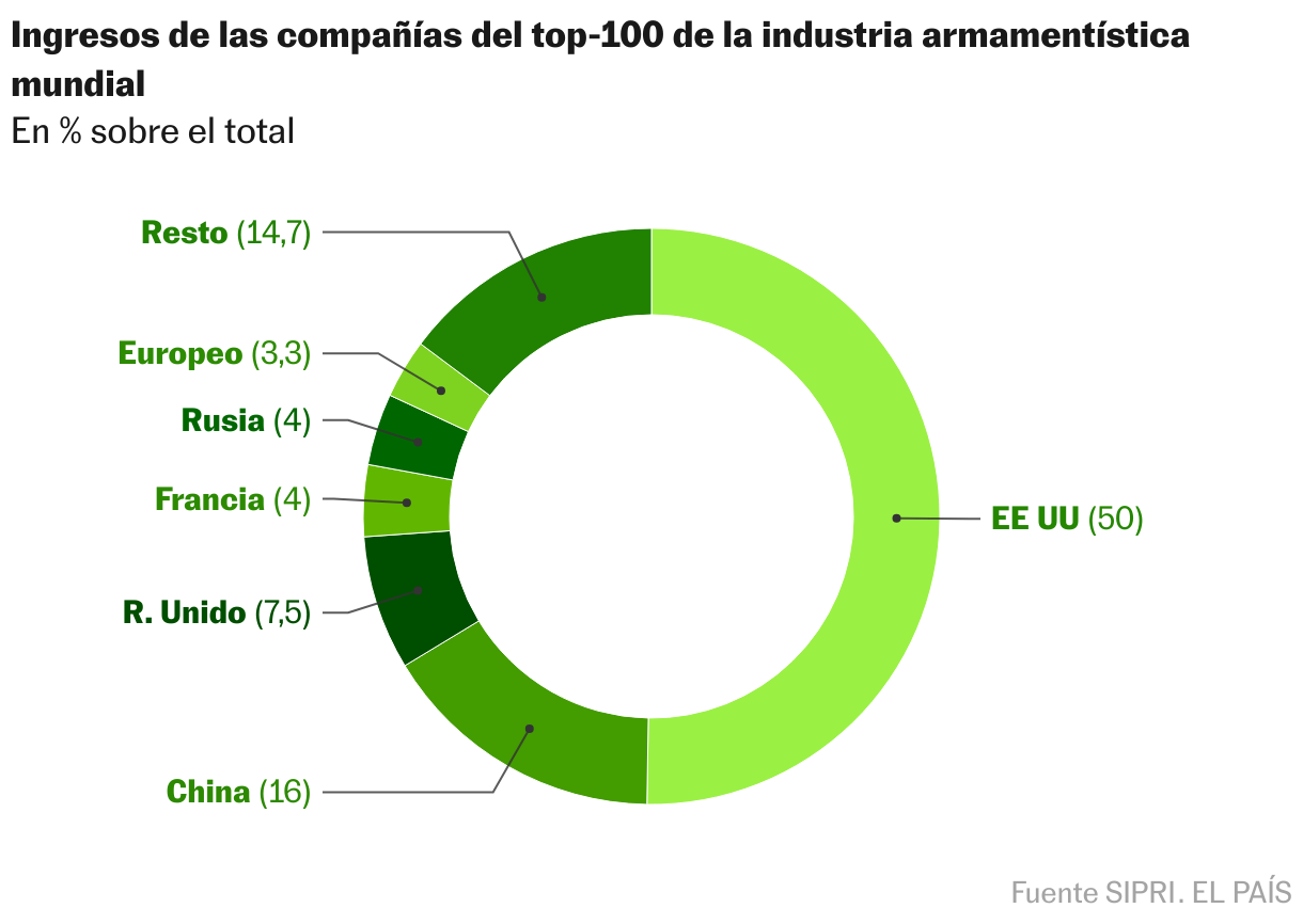Según el SIPRI, las 100 mayores empresas del sector a nivel mundial por facturación tuvieron en 2023 ingresos por valor de 632.000 millones de dólares, un 4% más que el anterior. El incremento desde 2015 a 2023 ha sido del 19% (en el caso del gasto militar total, el aumento hasta 2024 fue del 37%). La subida de la facturación ha sido, por tanto, menos intensa que la del gasto total en defensa. Pero esto responde a una natural lógica de mercado. Se tardará algunos años en ver completamente convertida en facturación la nueva apuesta por la defensa de los Gobiernos. El tiempo necesario en materializar en su plenitud el cierre de contratos, la ampliación de capacidades, la reordenación de procesos de producción y, finalmente, cobros completos.