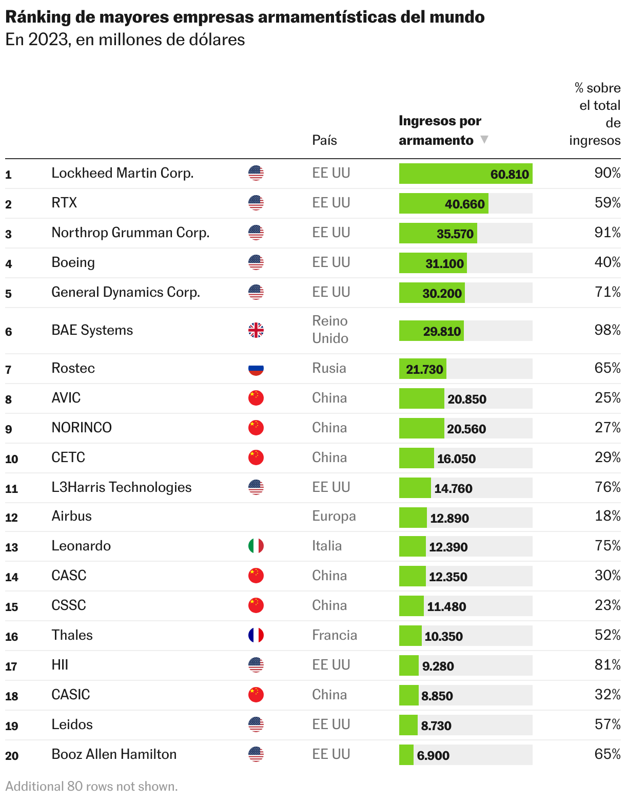 Precisamente la dificultad de ampliar capacidades por cuellos de botella en las cadenas de suministro ha sido uno de los factores que ha determinado que las dos compañías más grandes del mundo del sector -Lockheed Martin y RTX -ambas estadounidenses- hayan sufrido un retroceso en la facturación en términos reales con respecto al año anterior. No obstante, permanecen en la cumbre de la lista. Las compañías estadounidenses copan los cinco primeros puestos, y 41 entre los primeros 100, como demostración de un persistente protagonismo mundial del conglomerado industrial de defensa del gigante americano. Compañías chinas, europeas y rusas completan el cuadro de las fuerzas dominantes en el sector de la defensa.
