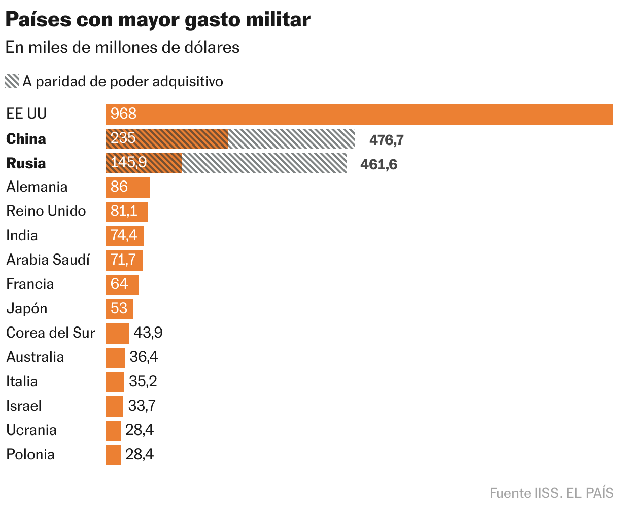 Pese al gran incremento del gasto militar ruso, en términos nominales este sigue muy inferior al de EE UU o China, y equivalente aproximadamente al de Francia y Reino Unido juntos. No obstante, es importante observar que, a paridad de poder adquisitivo, según una evaluación del IISS, el gasto militar ruso es equivalente al de toda Europa. Esto se debe al hecho de que una misma cantidad de dólares nominales consigue diferentes cosas en distintos lugares de acuerdo a los costes locales. Esta clave, a menudo olvidada en el debate público, es uno de los motivos por los cuales Rusia tiene una industria de guerra con un nivel de producción que desata muchas alertas en políticos occidentales.