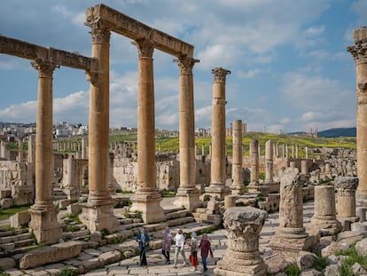 Hay una fotografía que representa esta idea muy bien. Unas ruinas romanas en Jordania, por las que pasea un grupo de refugiadas palestinas. “Las mariposas han estado pasando por allí durante millones de años, antes del auge o la caída de cualquier imperio humano”, explica el fotógrafo. “Esas chicas, cinco amigas, están migrando, caminando por las ruinas de un imperio caído. Lo hacen después de abandonar su país debido a la guerra. Y en el horizonte, más allá de las ruinas romanas, se ven edificios de nueva construcción. Son hogares para refugiados e inmigrantes”.