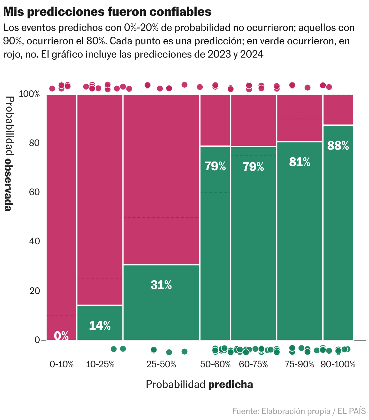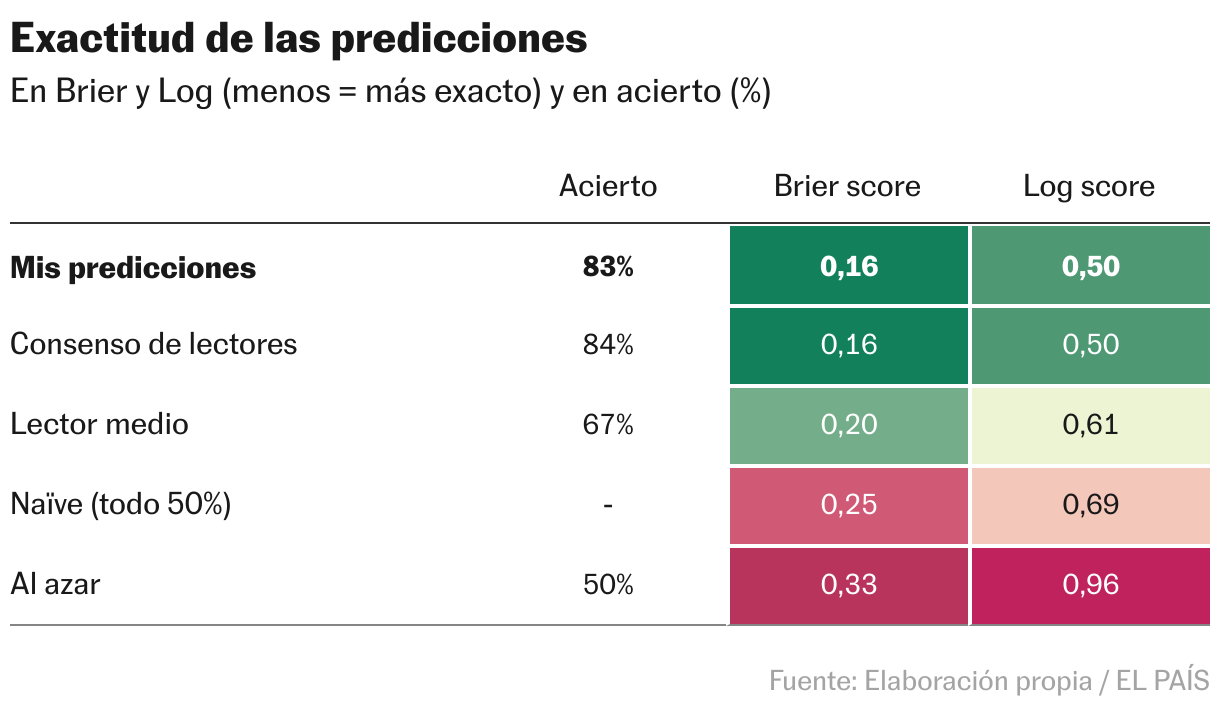 En la tabla también está mi puntuación Brier, que es una métrica mejor para medir el error de un pronosticador (ver metodología al final). Mi Brier (0,16) es mejor que el que logré el año pasado —más bajo— y muchísimo mejor que predecir al azar (0,33) o diciendo siempre 50% (0,25).