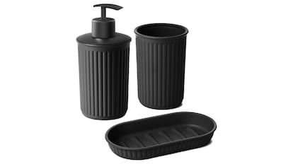 Este set, fabricado en plástico resistente con acabado mate, unifica la zona del lavabo. Su estilo sobrio y sus líneas limpias se adaptan tanto a baños minimalistas como a espacios más clásicos.