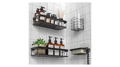 Prácticas, resistentes y con fijación autoadhesiva. Estas estanterías negras permiten mantener todos los productos de aseo organizados y al alcance. Su estructura metálica evita la acumulación de agua, garantizando su durabilidad y mejorando su limpieza.