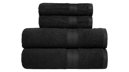 Un set completo que incluye dos toallas de baño y dos toallas de mano. Son muy absorbentes, están fabricadas 100% en algodón y presentan una textura suave al tacto. Su color negro intenso aporta un aire elegante y sofisticado al baño.