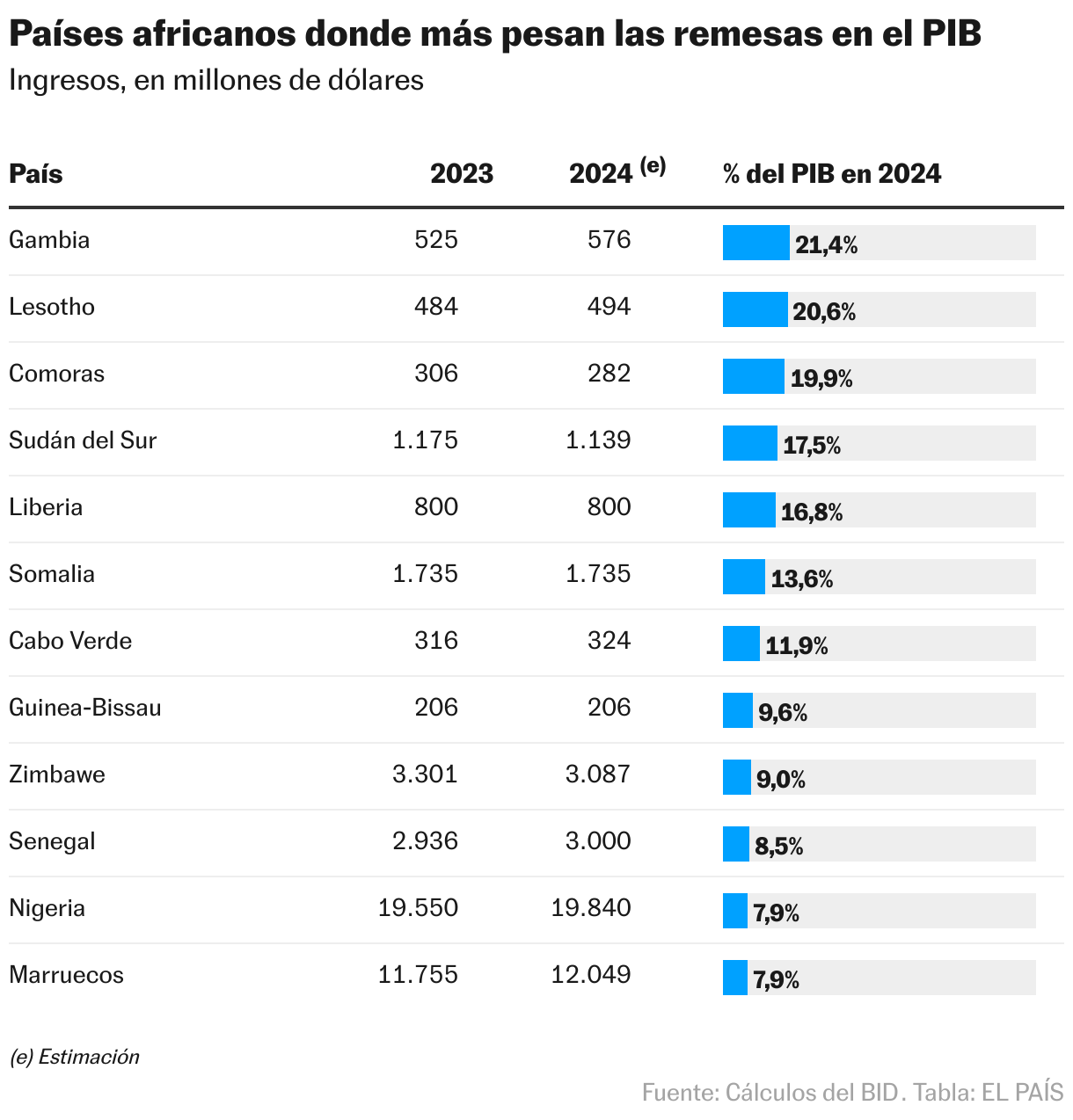 En África, más de 200 millones de personas se benefician de las remesas, según datos de Naciones Unidas. Con el dinero, las familias pueden pagar alimentos, educación, vivienda, servicios y gastos médicos. En 2024, África recibió más de 100.000 millones de dólares en remesas, de acuerdo con datos provisionales de expertos del Banco Mundial. Nigeria, con 19.800 millones de dólares al año, está en la cima de países que más reciben dinero por cuenta de las remesas. En otros Estados, las remesas representan una parte importante de su Producto Interno Bruto (PIB). En Gambia, por ejemplo, equivalen al 21,4% del PIB; en Sudán del Sur, al 17,5%, y en Lesotho, al 20,6%. Además, la ONU calcula, a partir de los datos de 2023, que las remesas en África equivalen a casi el 6% del PIB del continente y superan la Ayuda Oficial al Desarrollo (AOD) “que asciende a 42.000 millones de dólares y a la Inversión Extranjera Directa (IED), que es de 48.000 millones de dólares”.