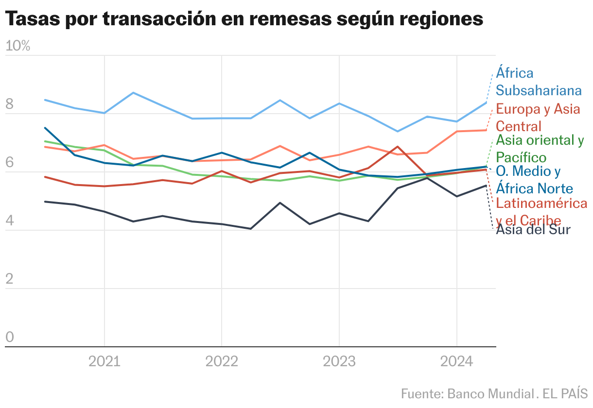 Pese a estos avances, aún hay brechas. África Subsahariana es la región más cara del mundo para enviar dinero y en la que más se ha encarecido esta transacción entre 2023 y 2024, según datos del Banco Mundial. En el mundo, enviar 200 dólares al exterior implica pagar de media una tasa del 6,65% por la transacción. Pero si esos 200 dólares van hacia África Subsahariana, la media de tasa es del 8,37%, una cifra bastante alejada de la meta de Naciones Unidas, que quiere reducirla a menos del 3% para 2030.