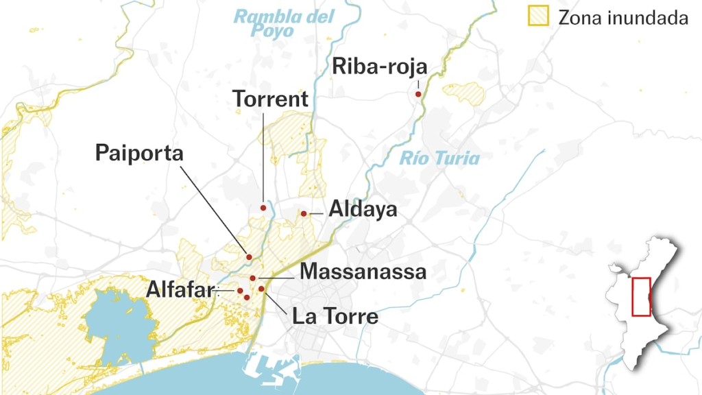 Aldaia, de 31.000 habitantes, ha perdido al menos a seis vecinos como consecuencia de la peor dana del siglo en España. No es la zona cero de la catástrofe, que es Paiporta, el municipio que ostenta el lamentable récord en un marcador de la muerte que, como el agua del martes, no quiere detenerse y por ahora alcanza los 210 muertos confirmados. Tampoco ha quedado completamente aislado como Chiva, donde el aguacero superó los 450 litros por metro cuadrado y dejó a los vecinos sin servicios básicos (luz, agua, teléfono) y sin ayuda. Pero ofrece algunas claves para entender lo ocurrido en la llanura valenciana, surcada de barrancos y rieras que, cuando llueve, transportan el agua hasta el Mediterráneo o la Albufera. El problema es que los núcleos de población han crecido a menudo demasiado cerca (incluso encima) de esos terrenos inundables, a merced siempre de los temporales y de las reivindicaciones del agua, que busca su espacio natural ajena a los caprichos del urbanismo.