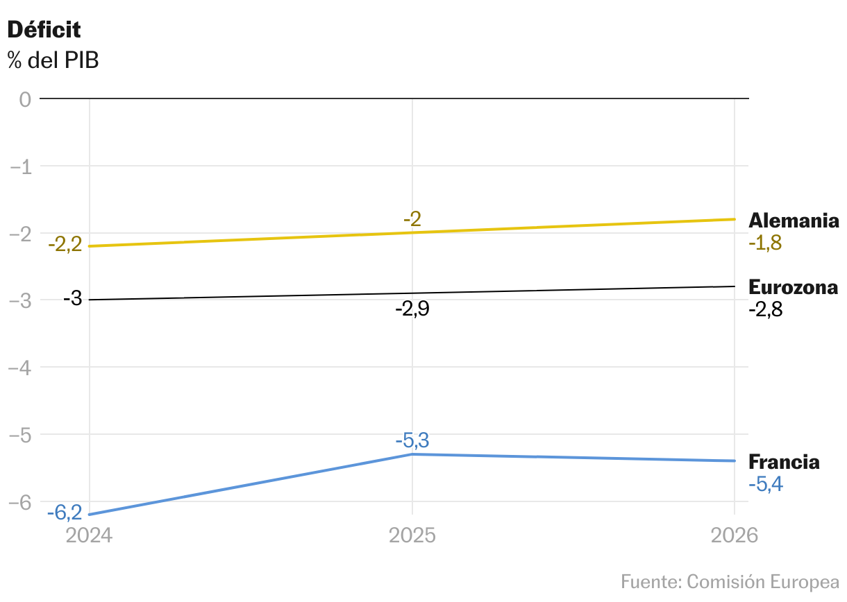 Al otro, Francia, con una crisis política profunda, estructural -cuatro primeros ministros en un solo año- que bloquea los necesarios ajustes fiscales en un país con una deuda pública que supera una cantidad equivalente al 110% de su PIB, que ha tenido que prorrogar unos presupuestos para 2025, que este año acabará con un agujero superior al 6% del PIB y que ha visto hace unos días como Moody’s, una de las grandes agencias de evaluación de bonos, ha rebajado la calificación de su deuda. Y, por si fuera poco, una coyuntura económica que amenaza con una contracción en la actividad durante el cuarto trimestre del año —ligera, eso sí— y un retroceso de una décima por la resaca de los Juegos Olímpicos, según el servicio de estudios del banco ING.