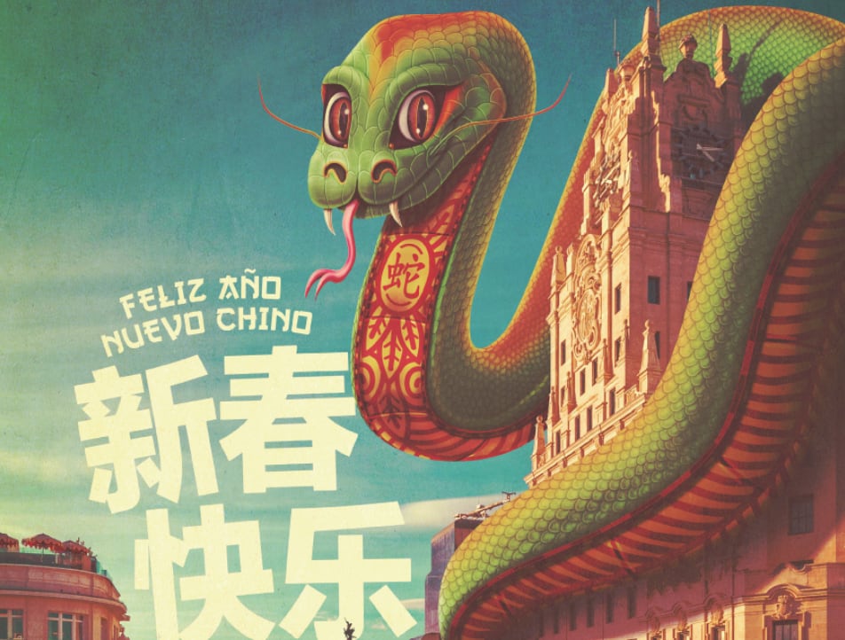 Este miércoles, 29 de enero, según el calendario lunar por el que se rige el gigante asiático, dará comienzo el Año Nuevo chino, que se corresponde con la serpiente de madera, un signo asociado con la sabiduría, la intuición y la renovación. Según la cultura china, cada 60 años, la combinación de un animal, en este caso, la serpiente, con un elemento, como la madera, se alinea, ofreciendo una caracterización especial al Año Nuevo. Así queda reflejado en el cartel de esta edición, que ha diseñado Juan Carlos Paz, ilustrador digital conocido como Bakea, en el que un ejemplar se enrosca el edificio del reloj de Telefónica, en la Gran Vía. Bakea lleva ya tres años diseñando la imagen de la fiesta en Madrid.