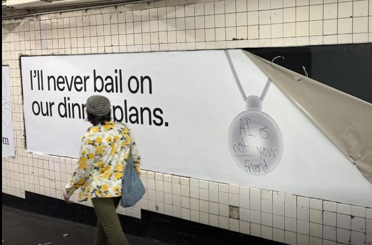 Lejos de aplaudir el ingenio del su creador, Avi Schiffmann, otro flipado de Silicon Valley dispuesto a sacar tajada de la epidemia de soledad pregonando que el “capitalismo es el mejor medio artístico”, la reacción ciudadana a su producto refleja resistencia y mirada crítica: “Haz amigos de verdad”, “La IA está quemando el mundo que te rodea” o “mejor vete a tocar hierba” son solo algunas de las pintadas sobre los 10.000 pósters colgados en la ciudad. Todo este boicot, además, se recoge en una página web con las fotos de las acciones, en las que aparecen ciudadanos arrancando los anuncios, apuntando lemas como: “Que te jodan”, “la IA no es tu amiga” o “busca amigos de verdad”. Por ahora, y antes de que llegue a Walmart, solo se han vendido unos 3.000 colgantes de la supuesta IA amistosa.