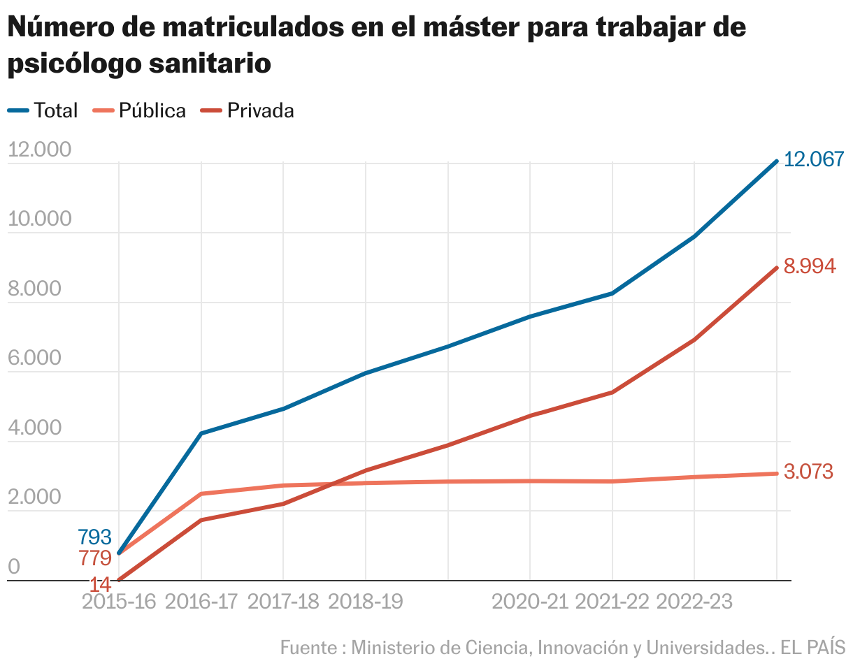 El grado de Psicología está de moda y las universidades responden a esa demanda abriendo sin descanso facultades, aunque las cifras de empleabilidad no lo aconsejen. La mayoría quiere dedicarse a la rama sanitaria y cuenta con dos opciones: sacarse el PIR (Psicólogo Interno Residente) para formarse y trabajar en hospitales ―apenas 274 plazas en 2025, aunque el doble que hace 15 años― o aprobar el máster de psicólogo general sanitario, obligatorio para pasar consulta. De forma que desde 2015 ―antes no era necesario― los estudiantes de este posgrado se han multiplicado de forma exponencial: de 780 alumnos a 3.000 en la pública y de 14 a 9.000 en la privada. Es decir, inscribe al 75%, aunque atesora el 84% de las plazas disponibles, por lo que tiene aún margen de crecimiento.