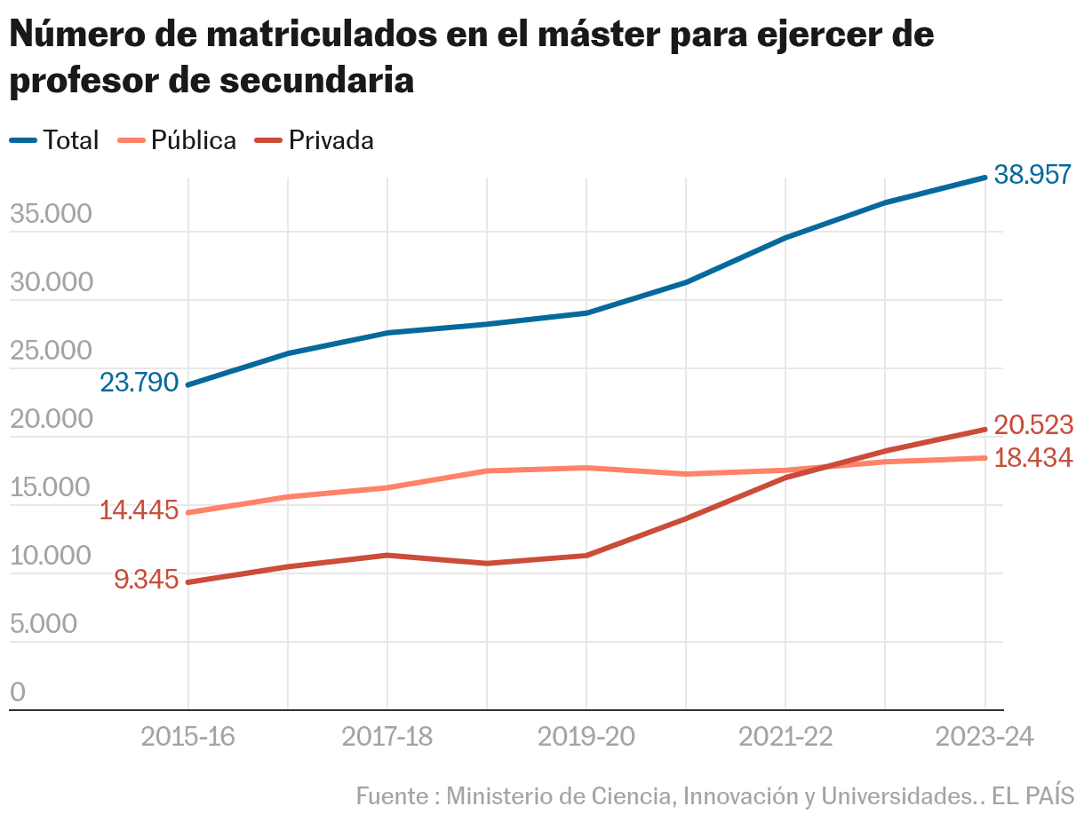 Antes del plan Bolonia, para ejercer de profesor de secundaria, los licenciados de cualquier especialidad tenían que aprobar el Certificado de Aptitud Profesional (CAP) con unas pocas horas teóricas y unas prácticas en un centro educativo. Pero ahora se cursa el máster en profesorado y las privadas han encontrado un nicho enorme: sus inscritos se han más que doblado (de 9.300 en 2015 a 20.500 en el 2023) y más de la mitad (54,6%) asisten a clase a distancia.
