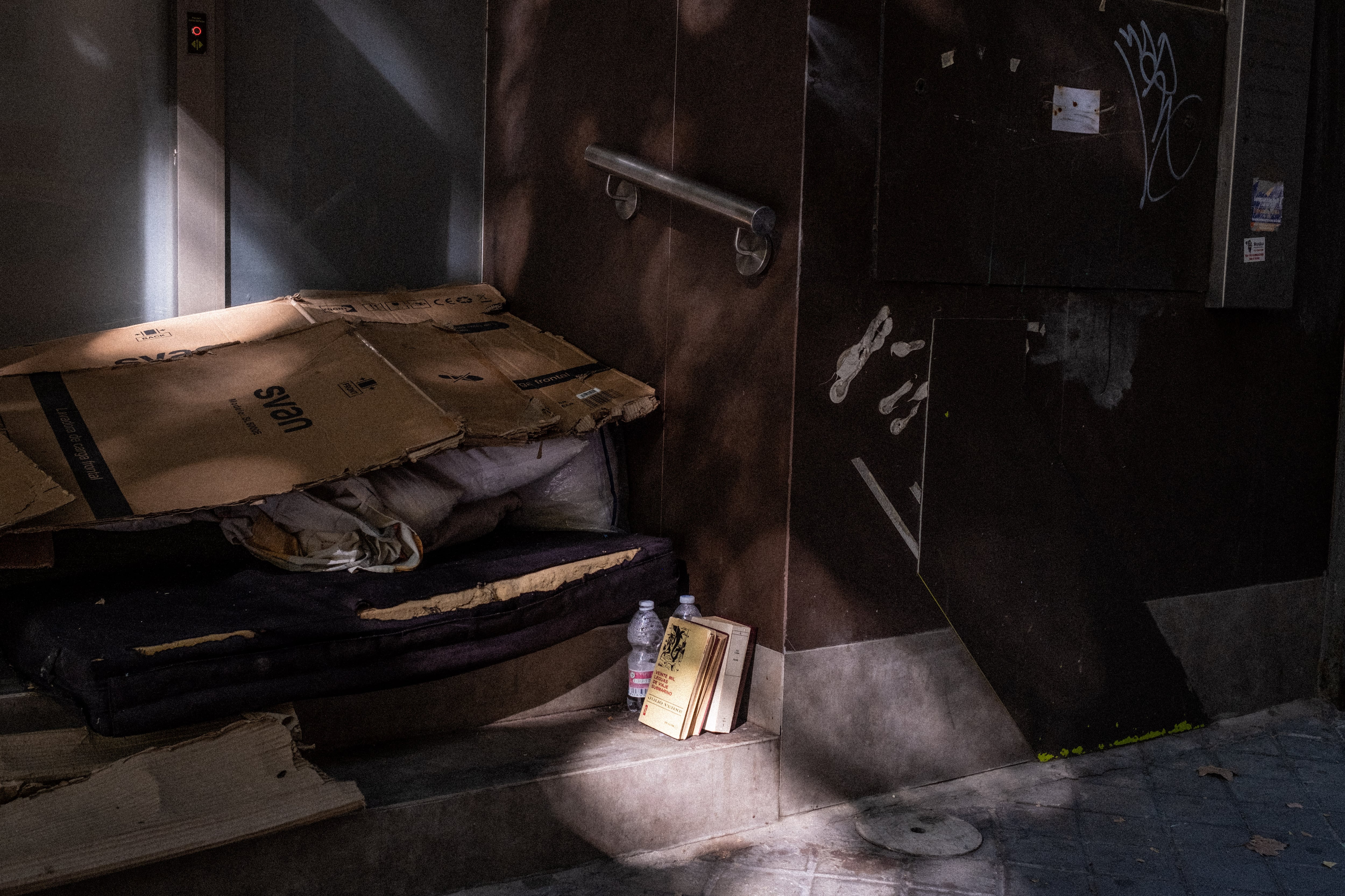 Cuando Miguel tuvo que ir al hospital hace un par de semanas, se le había manifestado por enésima vez el “síndrome de las piernas inquietas” —un trastorno neurológico que causa sensaciones desagradables e incómodas en las extremidades inferiores y un impulso irresistible de moverlas— que comenzó a padecer con 50 años. Por lo general consigue calmarlo caminando, aunque esta vez se volvió algo incontrolable. Tras recibir la atención médica necesaria, y todavía con mareos y el cuerpo hecho pedazos, Miguel emprendió la ruta hacia su colchón, algo así como su casa. Había desayunado unas galletas en el hospital, después había cogido un autobús gratuito que lo dejaba a varios kilómetros y anduvo como pudo por la calle en una especie de largo escalofrío hasta sentarse de golpe entre los cartones.