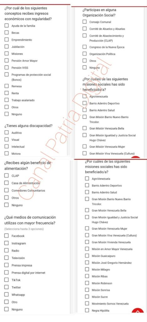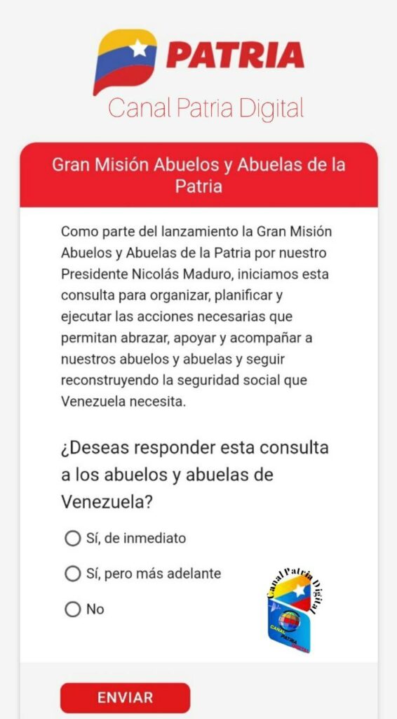- Llenar la encuesta, la cuenta consta de preguntas socioeconómicas, discapacidad, alimentación, misiones sociales y canales informativos.