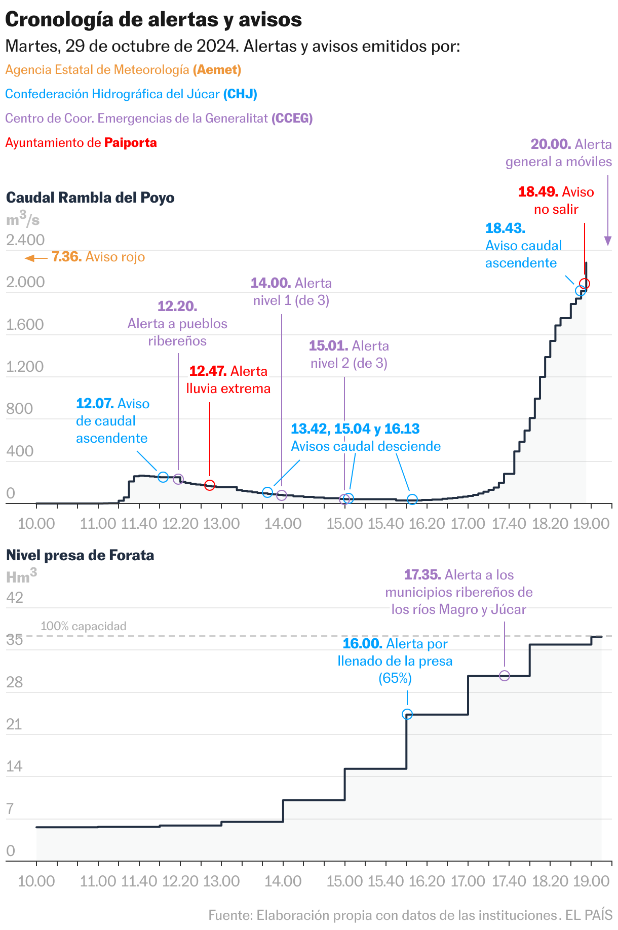 Lo que sigue es la reconstrucción de las horas clave antes de que la descomunal riada del barranco del Poyo golpeara a la población. Para realizarla se han empleado datos publicados en las web de la CHJ y de la Aemet, los avisos difundidos en la red social X por varias administraciones y los correos electrónicos enviados por la CHJ al Centro de Coordinación de Emergencias de la Generalitat. Además, el Ministerio para la Transición Ecológica y la CHJ han respondido a varias cuestiones planteadas por EL PAÍS; no ha contestado la Generalitat, a quien le correspondía declarar las alertas.
