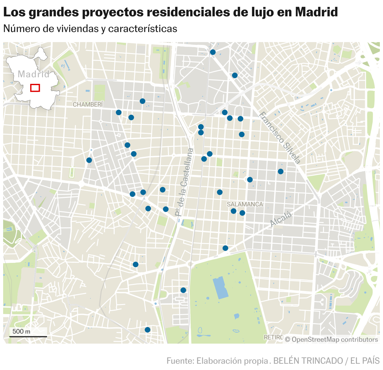 Madrid se ha convertido en el epicentro de la compraventa de vivienda de ultralujo en España. En la actualidad hay 30 proyectos en marcha, bien en construcción, en preventa o en las últimas fases de comercialización, a partir de los datos obtenidos de promotoras o vendedores, que están transformando el centro de la capital. Promociones que, en la gran mayoría, parten de un millón de euros para las viviendas de un solo dormitorio y que pueden llegar a los 13 millones para los áticos, pero que vuelan en los primeros días de comercialización. “Ese furor se desencadenó a partir de 2011, fecha en la que Amancio Ortega vendió un edificio a la socimi Millenium, que fue la primera que entendió que existía una demanda por viviendas de 500 metros de superficie y un ticket medio de 10.000 euros por metro cuadrado”, recalca Luis Valdés, director general del departamento de Residential Sales Advisory (ventas residenciales) en la consultora Colliers. Esta es precisamente una de las consultoras que más proyectos de venta maneja en la capital (Castelló 108, San Bernardo, 126 o María de Molina, 42, entre otras).
