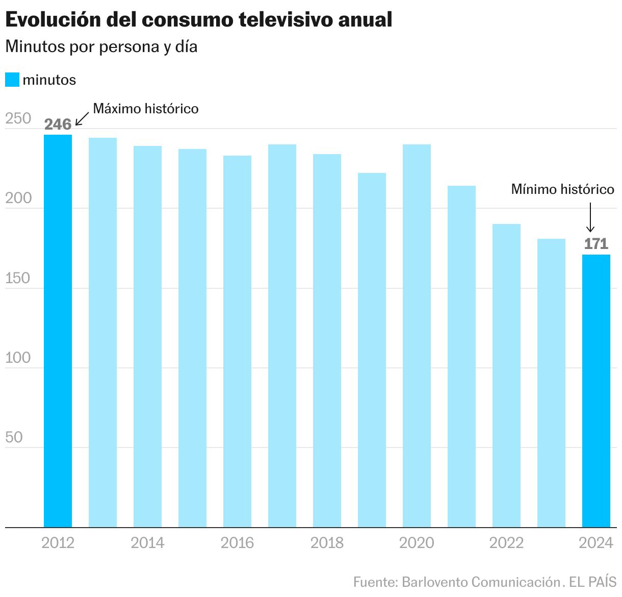 El informe de Barlovento suma el consumo de la televisión tradicional lineal (la que se ve al mismo tiempo que se emite en un canal determinado) y el diferido (la que se ve en los siete días siguientes a su emisión). En ese cómputo, en 2024 se vieron 171 minutos diarios por persona, 10 minutos menos que en 2023. Es el dato más bajo anual, muy lejos de los 246 minutos de 2012, cuando se alcanzó el máximo de tiempo diario delante de algún canal de televisión en España.