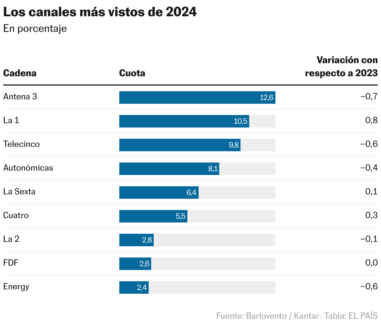 Antena 3 fue la cadena más vista por tercer año consecutivo. Lo ha conseguido con un 12,6% de cuota media, 0,7 puntos menos que el año pasado. Le sigue La 1, con un 10,5% de cuota, el canal que más sube respecto a 2023 (0,8 puntos más), su mejor dato anual desde 2018. Telecinco se queda en tercer puesto con un 9,8% de cuota, su mínimo anual histórico, ahondando en su profunda crisis. Les siguen La Sexta (6,4%), Cuatro (5,5%) y La 2 (2,8%). Cuatro canales marcaron máximo anual histórico: Atreseries, BeMad, DKiss y Ten. Y también el conjunto de las temáticas de pago, que sumaron un 10,9%. Por grupos, Atresmedia lidera (26,4%), seguida por Mediaset (24,9%) y RTVE (15,8%). Antena 3 fue líder 286 días del año, La 1 lo fue 59 días y Telecinco, 20 días.