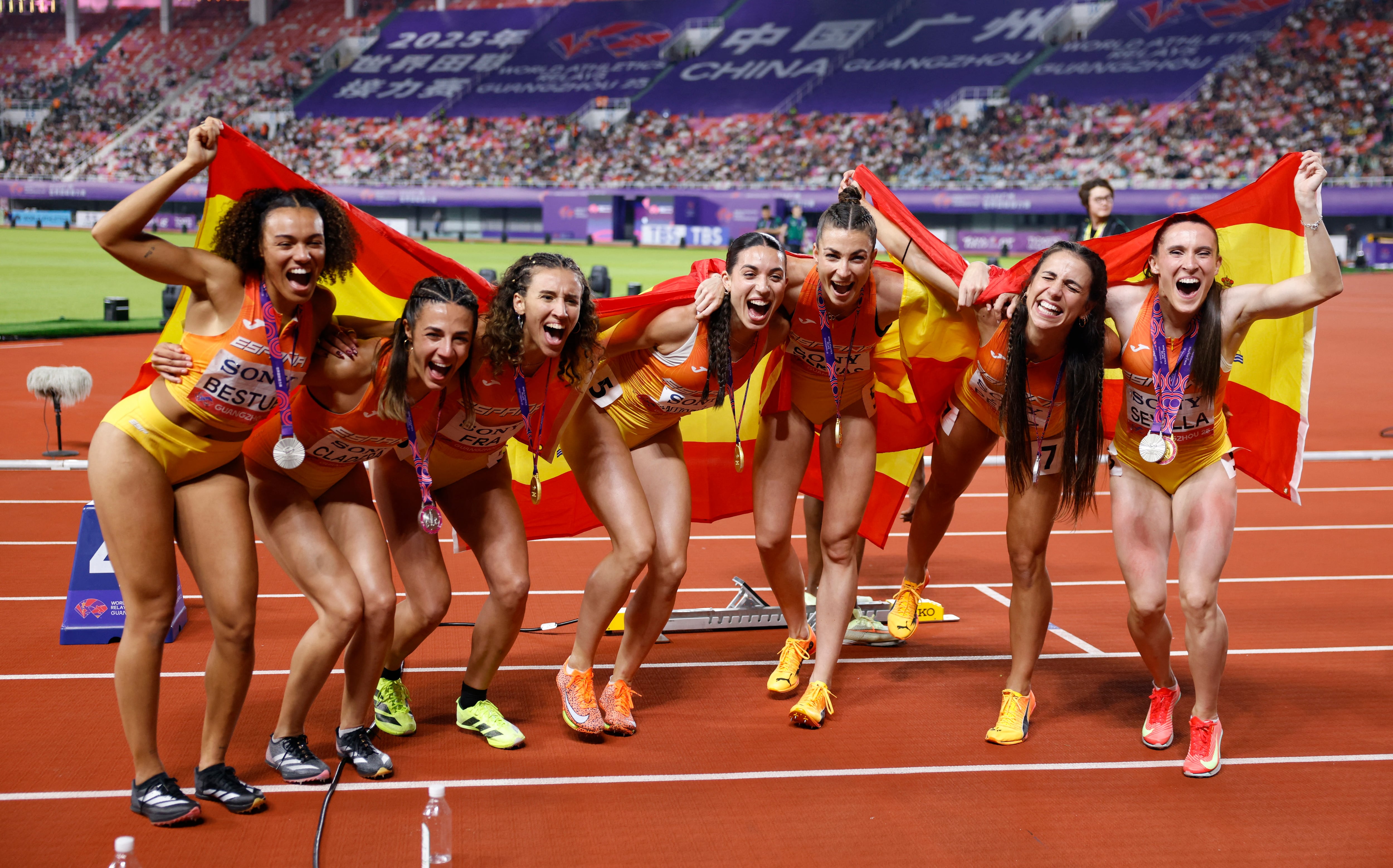 Las del 4×400, mientras, se muestran a la altura de las expectativas que crearon en los recientes campeonatos de España en pista cubierta —las cuatro por debajo de 52s, un pleno impensable— y que mantuvieron con un cuarto puesto doloroso en los Europeos de Apeldoorn. Y más aún. Se autodenominan golden bubbles, doradas, evanescentes burbujas como las del champagne, y han conseguido el jackpot. Han ganado la final y, además, han batido el récord de España (3m 24,13s, 11ª mejor marca del mundo en la última década), y al día siguiente de regresar a España desde la lejana China, las cuatro, junto a las tres del 4×100 —Paula Sevilla, reactivo explosivo, participa en las dos distancias— son las estrellas en La Revuelta, top prime time para mujeres atletas que reivindican plenamente su transcendencia más allá de su mero valor deportivo.