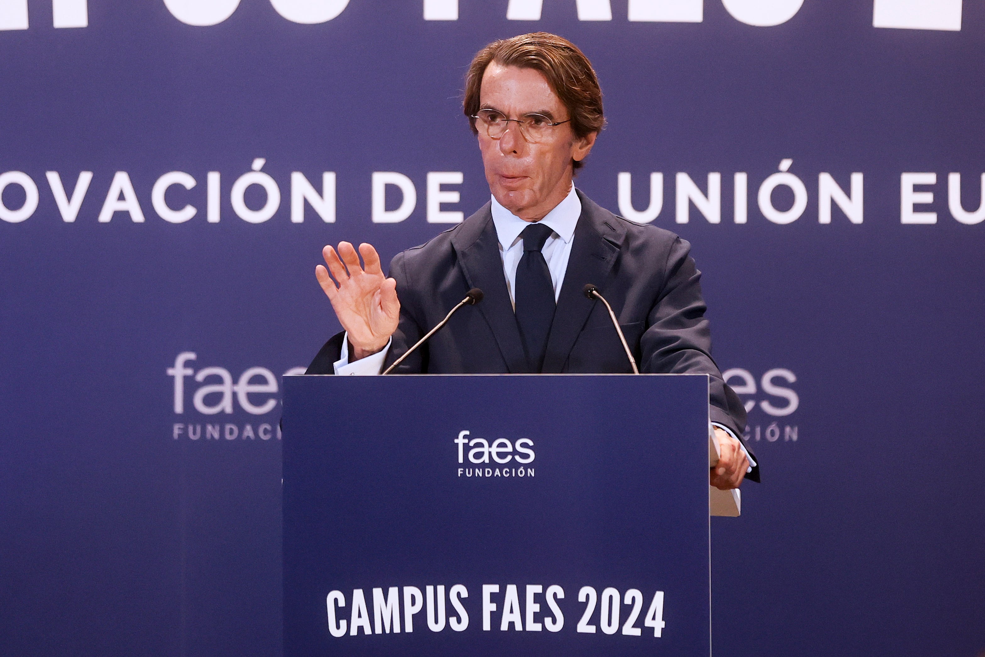 Faltan unos minutos para que José María Aznar entre en la sala blanca. La sala del céntrico Hotel Petit Palace de Madrid está repleta para escuchar al que fuera presidente del Gobierno entre 1996 y 2004. También llega la eurodiputada y hoy portavoz de los populares en el Parlamento Europeo, Dolors Montserrat. Ninguno hace declaraciones ante la prensa. Aznar, sí, a través de un discurso leído de unos 20 minutos, que ha servido para inaugurar este lunes el Campus de la Fundación para el Análisis y los Estudios Sociales —más conocida por su acrónimo FAES y ligada al PP— bajo el título La renovación de la Unión Europea. El también presidente de FAES, acompañado de su esposa, Ana Botella, ha criticado duramente las políticas de Pedro Sánchez y, sobre todo, el reciente acuerdo de financiación singular con Cataluña entre socialistas y ERC —a cambio de hacer president a Salvador Illa—, un pacto que ha indignado a otras comunidades autónomas. Aznar ha sido tajante: