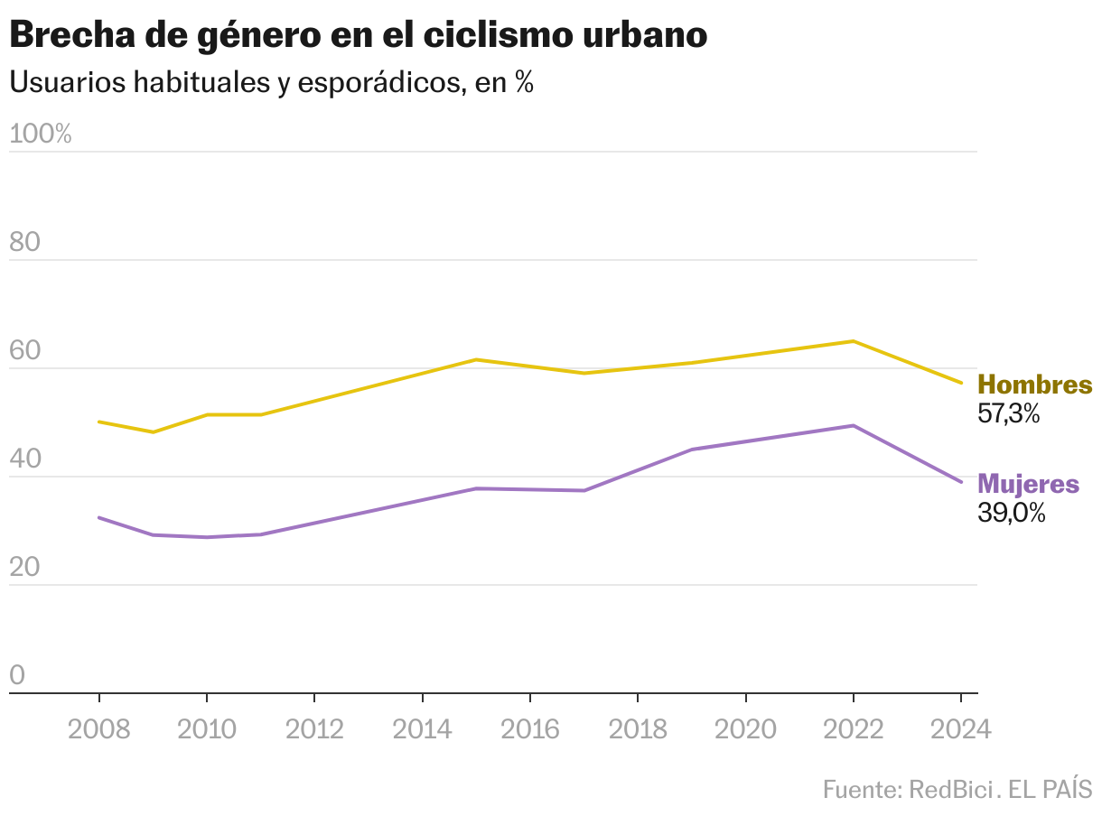 Otro dato negativo es la brecha de género, que no termina de cerrarse y pasa de 15 a 18 puntos de diferencia en dos años. “En 2022 había un deseo de ir en bici tras la pandemia y creció incluso más entre las mujeres. Pero ahora ha vuelto a nivel normal”, ha apuntado Pont. Varias expertas en movilidad piden impulsar carriles bici seguros y potenciar la formación vial de las mujeres para luchar contra una brecha de género que se mantiene desde hace años.