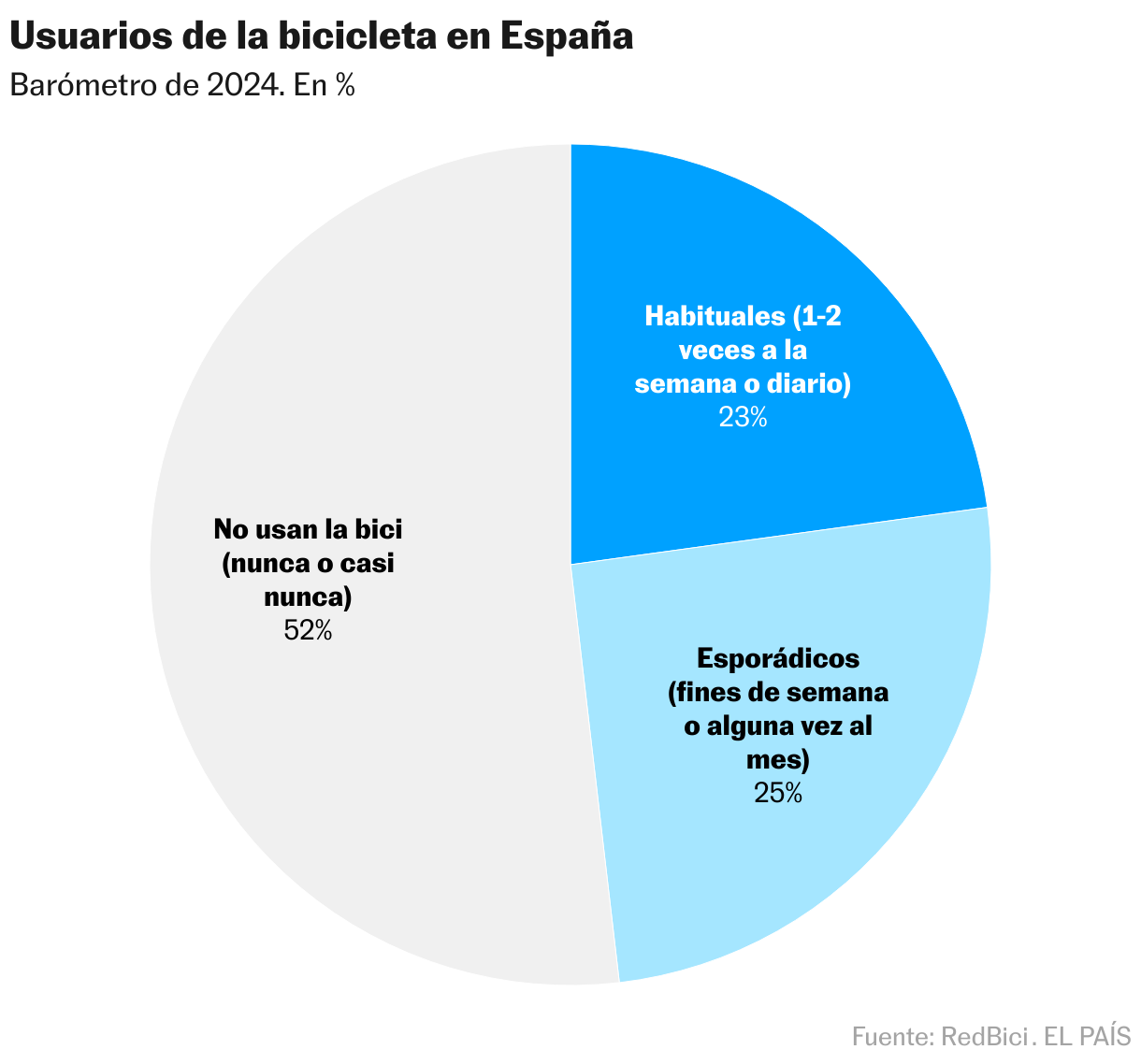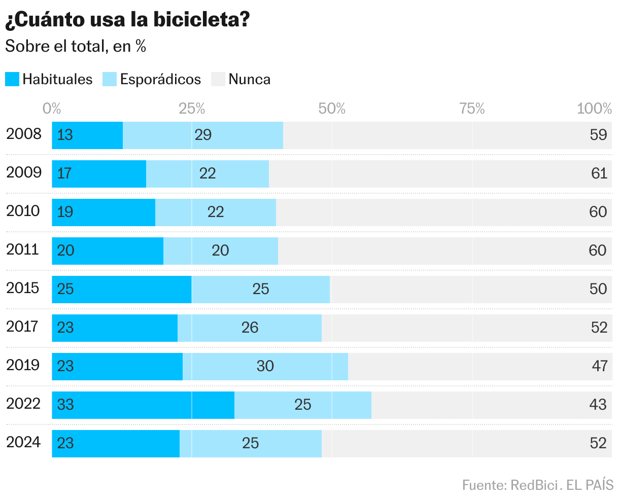 ¿A qué puede deberse esa bajada? “La pandemia ha modificado muchos hábitos. Se ha abaratado mucho el transporte público, que lo ha hecho muy accesible y ha movido a muchas personas hacia metros, trenes, autobuses y tranvías, dejando de usar la bici. Se han modificado los hábitos laborales, como el teletrabajo, porque es más fácil y más barato, y además un 15% de familias tienen ya un patinete eléctrico en su casa”, ha continuado Poveda. En cambio, los ciclistas esporádicos —aquellos que pedalean solo los fines de semana, o alguna vez al mes, y están más relacionados con el ocio o el deporte— se mantienen en las mismas cifras que hace dos años.