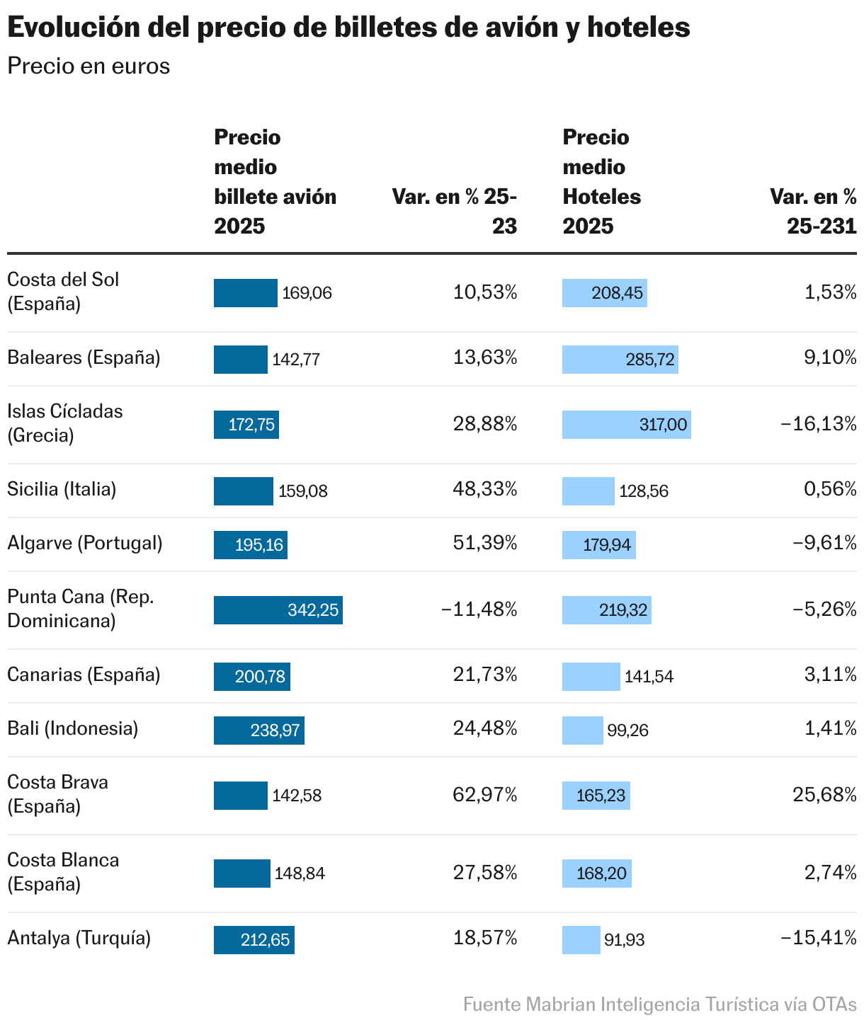 Esto sucede en las ciudades europeas y con los paquetes de importe mínimo. Pero la plataforma de inteligencia turística Mabrian ha hecho un estudio para este periódico comparando las tarifas medias de las playas españolas con las de algunos de sus competidores internacionales y los resultados siguen apuntando en la misma dirección: los precios de las vacaciones este año son imposibles para muchas familias. Los vuelos han subido entre un 10% y un 63% en las costas españolas entre 2023 y 2025, y los hoteles entre un 2% y un 26%, bastante por encima de lo ocurrido en otros países, tal y como admitía recientemente en este suplemento Federico González Tejera, consejero delegado de Radisson Hoteles.