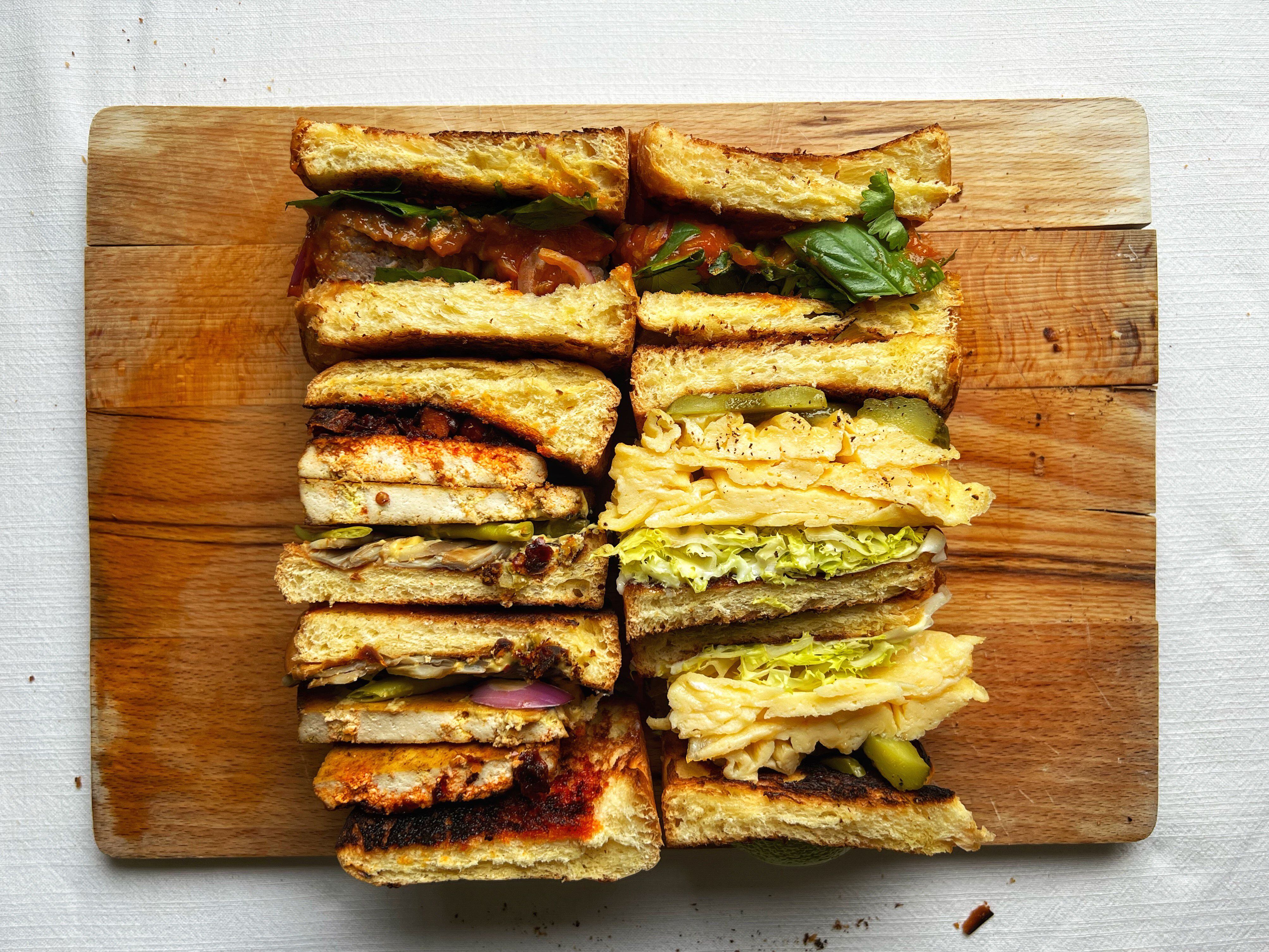 El mundo de los bocadillos es infinito, porque lo puede ser todo; hoy vamos a ver cómo preparar tres tipos de bocadillos bastante diferentes y usando un mismo tipo de pan. Un clásico bocata de huevos revueltos con alioli y encurtidos; otro vegano de tofu ahumado, setas tostadas, más encurtidos y salsa picante. Y el último, algo más trabajoso, de albóndigas con curry tailandés. El primero se prepara en un pestañeo, y los otros dos pueden ser sobras de otros días, así que no hay excusas. Para todos utilicé brioche, que siempre queda más jugoso y tostadito por la propia mantequilla que lleva; pero, como con el relleno, restricciones cero: usa el pan que te apetezca: barra, hogaza, sin gluten o lo que se tercie.