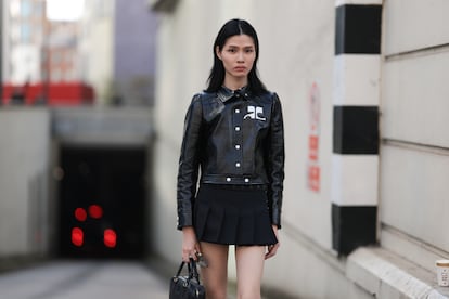 La chaqueta de vinilo de Courrèges había nacido mucho antes, en los sesenta, cuando André Courrèges revolucionó la moda con su visión futurista. Inspirado por la carrera espacial, el diseñador francés introdujo materiales como el vinilo y las líneas geométricas en su colección de 1964, titulada Space Age. Aquella chaqueta, brillante y estructurada, simbolizaba modernidad, juventud y emancipación femenina. Con el tiempo, se convirtió en un icono del estilo “mod” y del espíritu optimista de la década. En la década de los noventa, la chaqueta estuvo presente en algunos capítulos importantes de la moda y la cultura pop: en 1995 la recuperó Kate Moss, fotografiada por Nick Night para la revista Vogue USA. Ese mismo año se estrenó Casino, de Scorsesse, con una fantástica Sharon Stone y un también fantástico vestuario, en el que destacó la reconocible chaqueta, esta vez en un azul intenso. Un año después y en azul marino la llevó Angelina Jolie en La luna del desierto, una película que no pasó a la posteridad por su crítica, pero que cimentó su estatus de superestrella. Más recientemente ha recuperado brillo gracias a algunas estrellas de nuestra época (Lily Collins en Emily in Paris, Dua Lipa en Vogue o Anya Taylor-Joy) e incluso la nueva “diva del pop” español, Aitana.