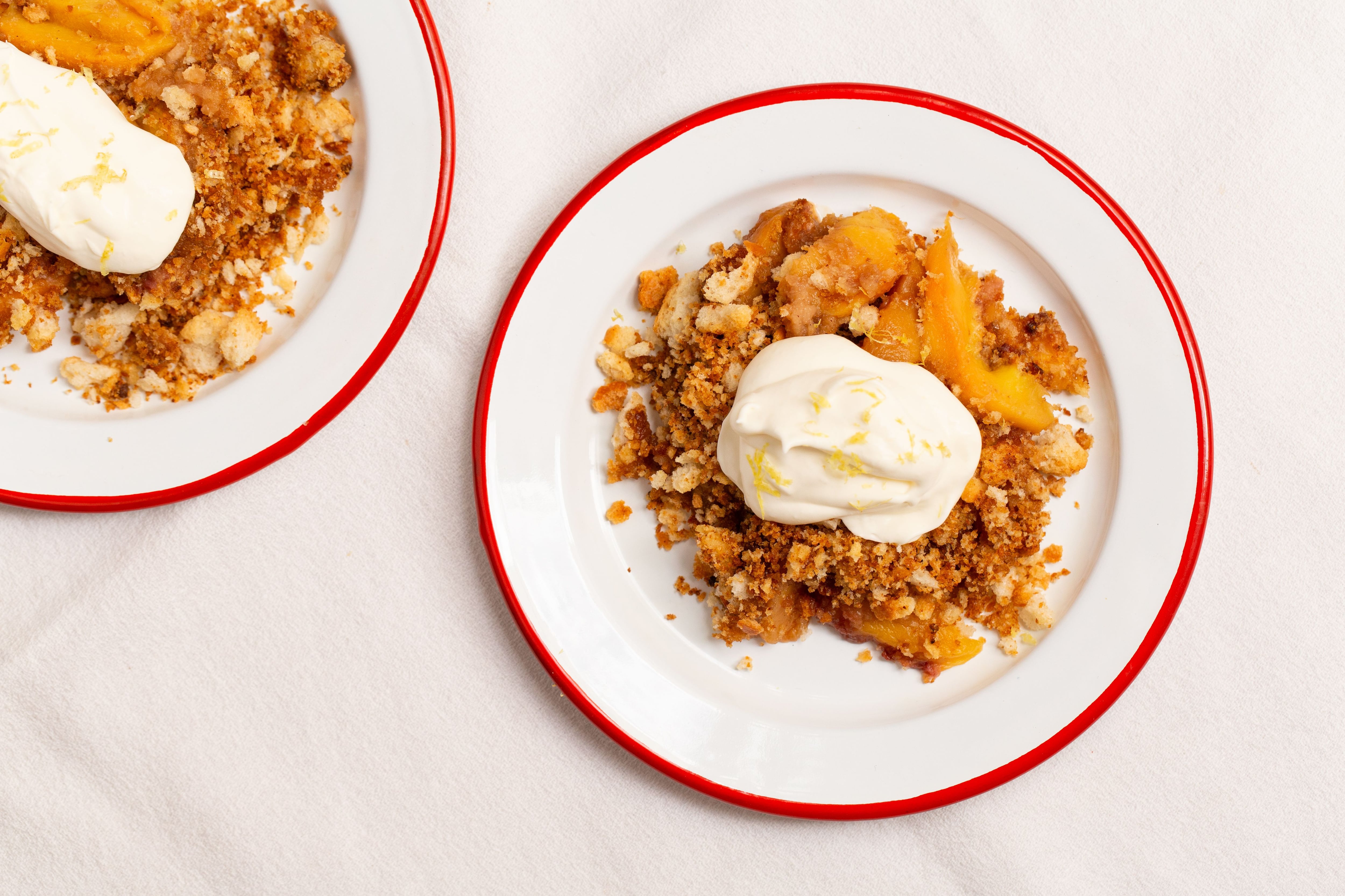 Imagina unas migas dulces. Ahora combínalas con fruta asada con canela y sirve todo templado con nata montada o helado. Eso es, exactamente, un brown Betty, un postre de origen estadounidense que pertenece a ese género de la repostería donde están el crumble, el cobbler o el apple crisp cuya gracia está en combinar la fruta asada –tierna, dulce y especiada– con una mezcla de algún tipo de hidrato con azúcar y grasa –crujiente, tirando a seca y mantequillosa–. El brown Betty se suele preparar con manzana pero se puede preparar con otras frutas como fresas, albaricoques, ciruelas, peras, frutos rojos, o como haremos en este caso, melocotones.