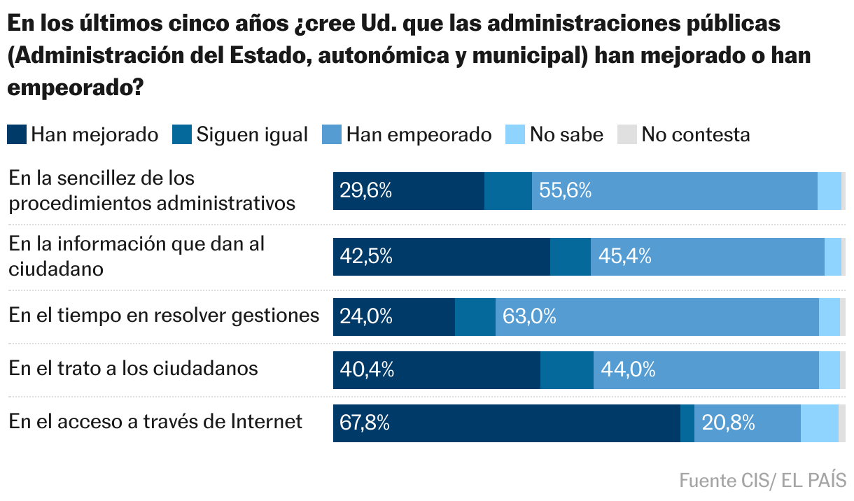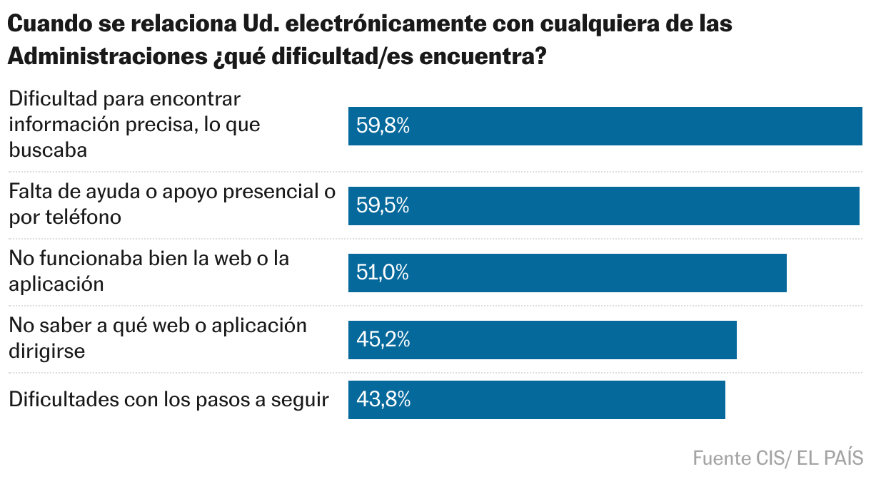 Este es uno de tantos ejemplos de cómo la digitalización impacta en el día a día de la actividad económica. Con sus indudables beneficios: los 80 euros del coste medio que supone presentar una solicitud presencialmente ante la Administración (por gastos de desplazamiento, tiempo y permisos de trabajo) se convierten en cinco euros si el mismo trámite se realiza por vía electrónica, según Concepción Campos, experta en gestión pública. Pero la Administración casi siempre ofrece una experiencia de usuario poco amigable —y si no, que se lo pregunten a los compradores de deuda del Estado cuando en la pantalla del Tesoro Público aparece el mensaje de “sitio no seguro” por no tener instalados los certificados de firma electrónica—.