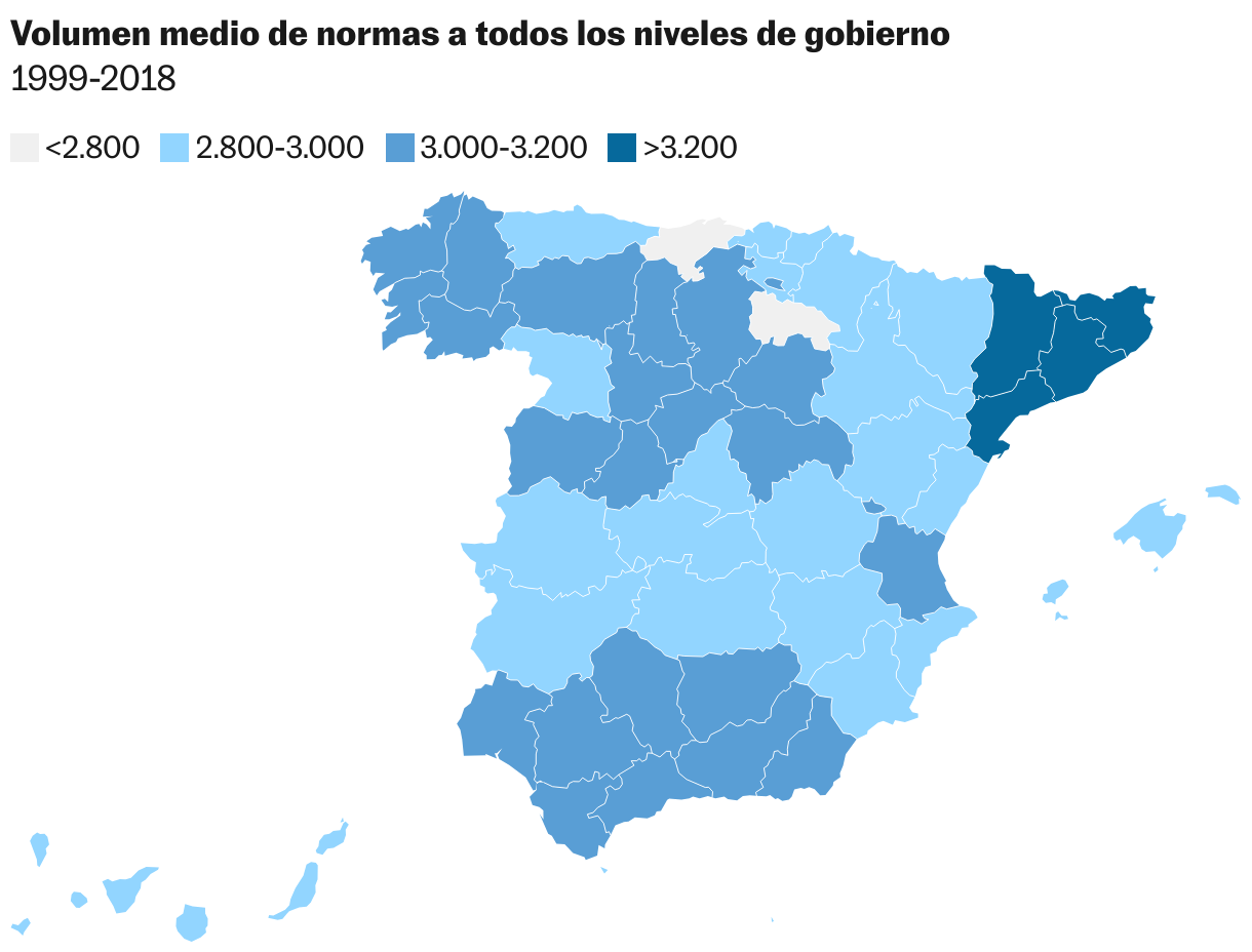 El Centro de Estudios Regulatorios de la Universidad George Washington contabiliza que las normas federales en Estados Unidos superan ahora las 180.000 páginas, frente a las 20.000 de principios de la década de 1960. En España una aproximación parecida la ha hecho Juan S. Mora Sanguinetti, del Banco de España, para concluir que entre 1950 y 2018 se redactaron 423.838 normas, la mayoría (364.267) en el periodo democrático. Desde 1979, la suma anual de nuevas leyes y reglamentos se ha multiplicado por cuatro aunque la población solo haya crecido en ese tiempo un 30%.