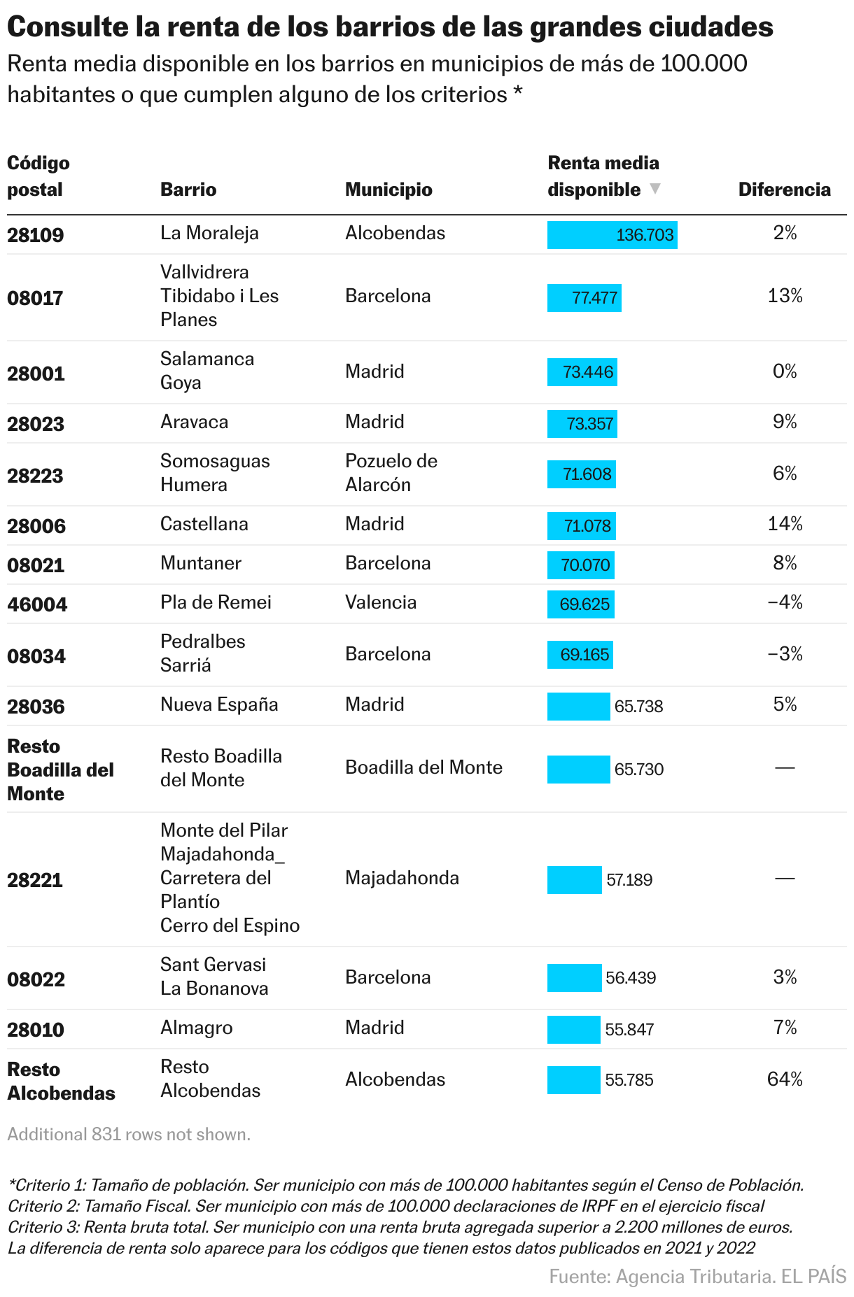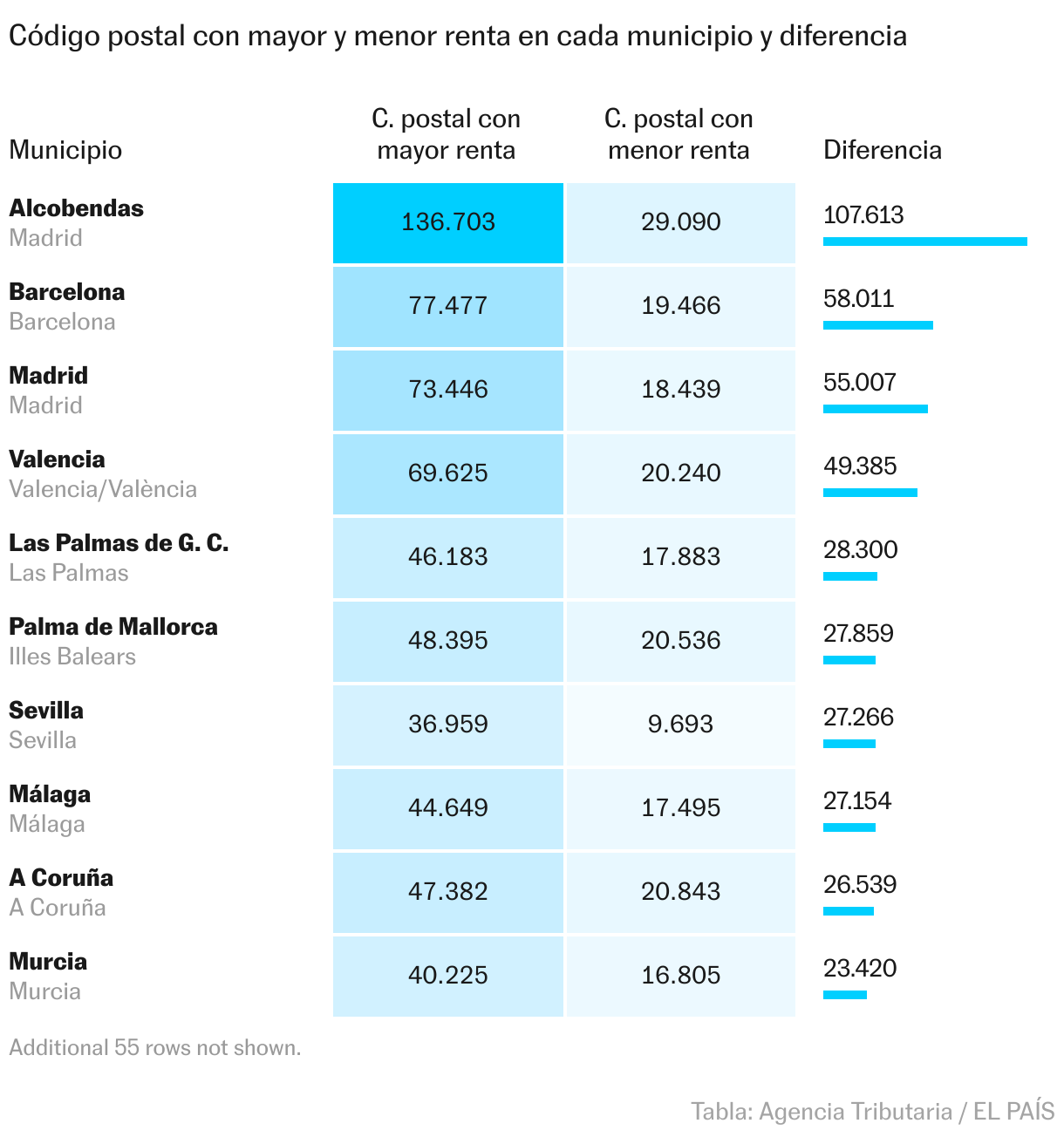 La otra conclusión que evidencian los datos de la Agencia Tributaria es que existen grandes brechas de renta dentro de un mismo municipio. La más amplia es la de Alcobendas, en Madrid: entre el código postal con mayor y menor renta de esta localidad hay una diferencia de 107.613 euros. Esta distancia coincide con los datos del Instituto Nacional de Estadística, que sitúa el municipio al norte de la capital como uno de los más desiguales. De acuerdo con la estadística de Hacienda, las segundas dos mayores brechas se dan en Madrid y Barcelona, en ambos casos superiores a los 50.000 euros. Una instantánea que refleja otra tendencia común en las grandes ciudades: el crecimiento económico aumenta la riqueza, pero tiene el riesgo de ser desigual.