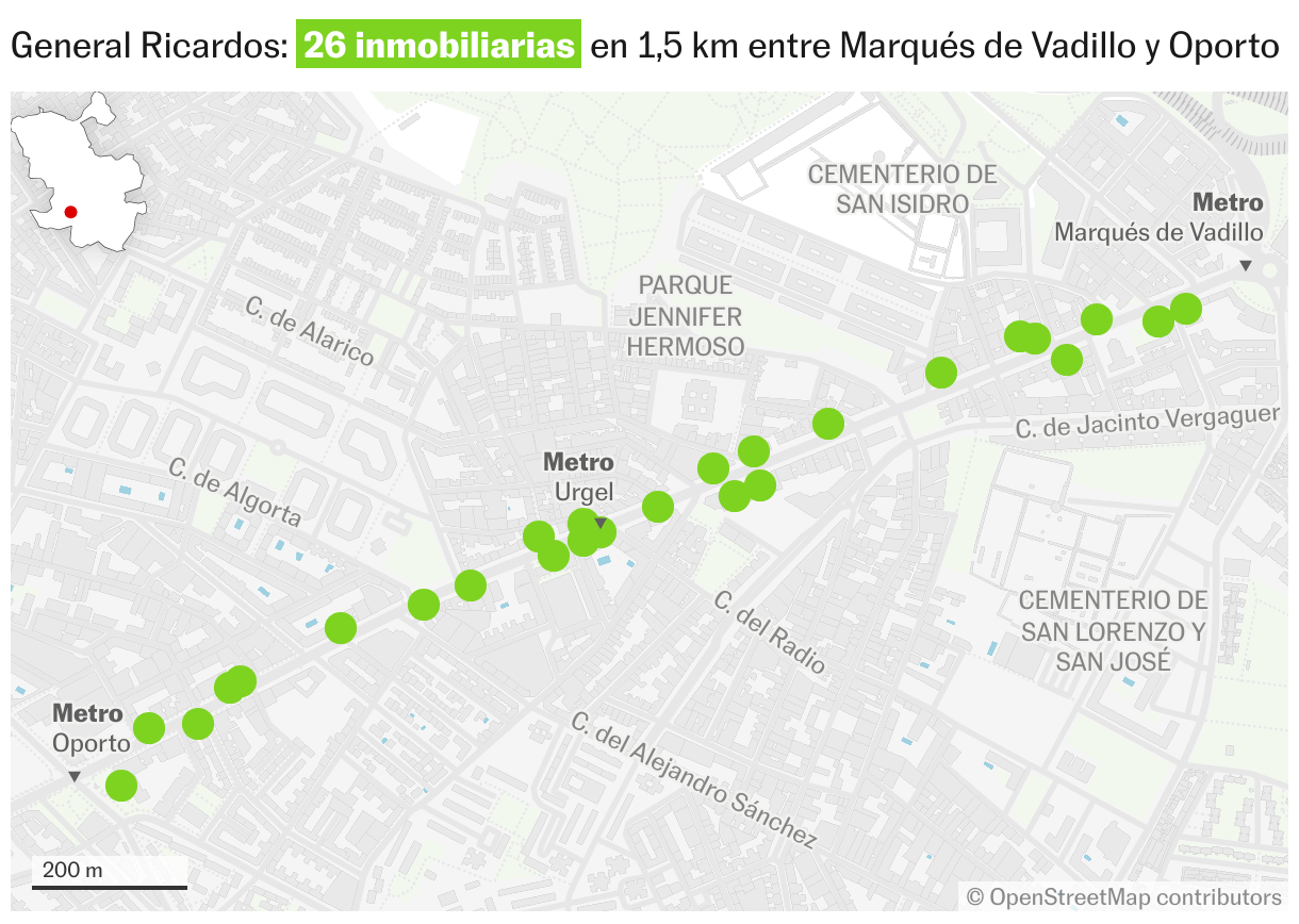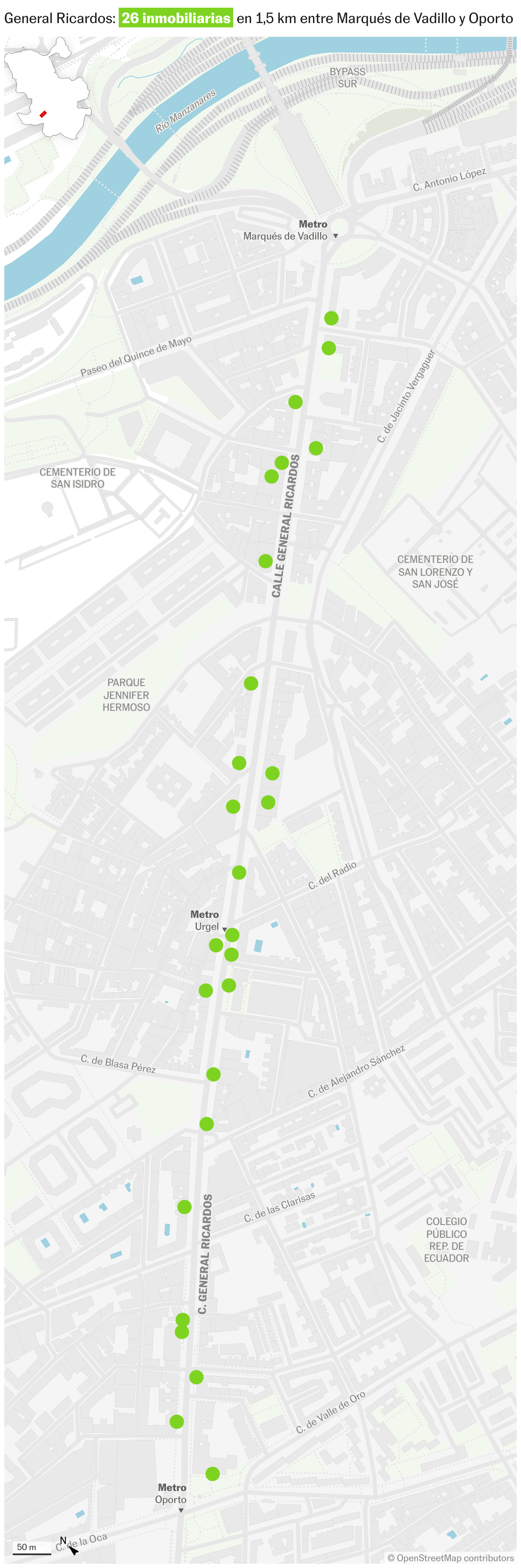 En el caso de que las ofertas no le resulten convincentes, al llegar a la superficie e incorporarse a la calle de General Ricardos, da igual si sube o si baja la vía, da igual si lo hace por la derecha o por la izquierda, a su disposición encontrará 26 oficinas inmobiliarias ―una cada 60 metros― y a unos 110 agentes ―uno cada 14 metros― para vender o comprar su casa. Este tramo de apenas 1.500 metros en Carabanchel Bajo es la calle de Madrid con mayor presencia por metro cuadrado de este tipo de negocios, donde el mercado de la vivienda se muestra en su máxima expresión y donde la feroz competitividad entre los captadores de pisos —el bien más preciado de la ciudad— se hace más palpable.