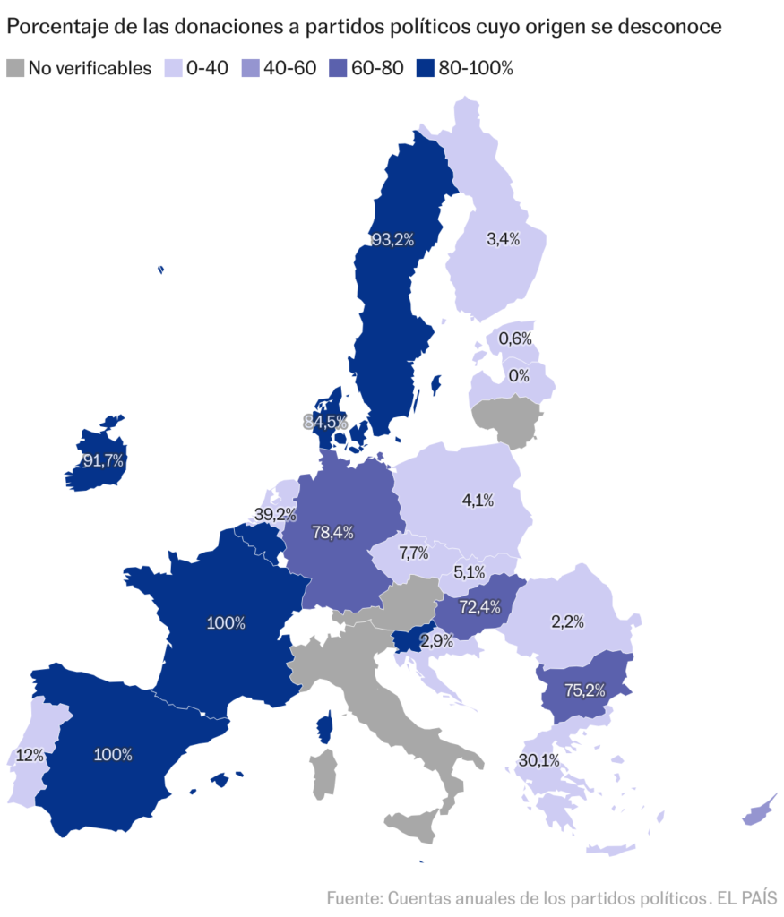 Comparte en tus redes sociales Los principales partidos políticos de los 27 Estados miembros de la UE recibieron 941 millones de euros en donaciones entre 2019 y 2022, pero siete de cada diez no tienen un origen conocido. Este escasísimo nivel de transparencia es el que exigen las leyes a […]