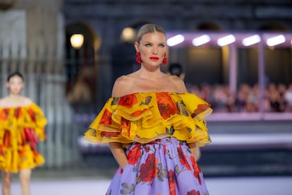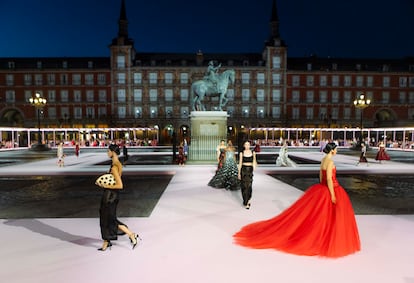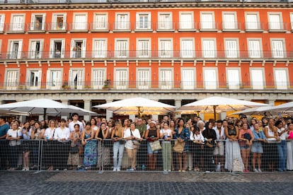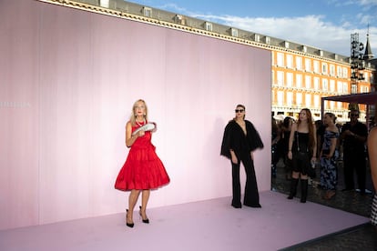 La plaza Mayor de Madrid, el lugar donde se celebró el jueves el desfile de Carolina Herrera, era más que un escenario. No solo por las dimensiones de una presentación poco habitual en la capital, que ha congregado a 800 invitados —150 de ellos internacionales— y ha sentado en el mismo banco a artistas como Sebastián Yatra, Amaia, Becky G, Tokischa o Bb trickz, it girls primigenias como Olivia Palermo y Alexa Chung, modelos como Vittoria Ceretti y Karolina Kourkova, actrices como Ana Rujas o Aitana Sánchez-Gijón, cineastas como Pedro Almodóvar, el alcalde de Madrid y una nutrida representación de la farándula, de Mar Flores a las nuevas celebridades de las redes sociales. En la plaza, los clientes de los bares de los soportales, abiertos durante el desfile, contemplaban con curiosidad la larguísima pasarela —casi un kilómetro lineal— rosa pálido y el bullicio habitual en los desfiles de moda.