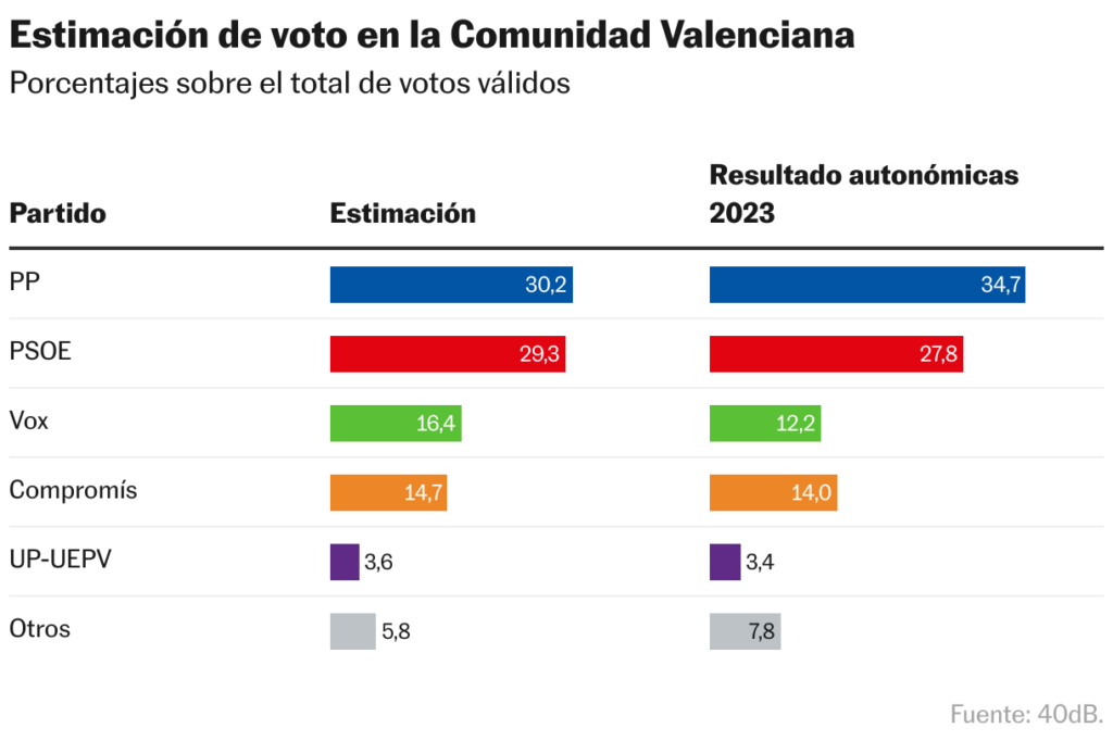 La encuesta monográfica sobre la dana elaborada por el Instituto 40dB. para EL PAÍS y la Cadena SER evidencia que la tragedia ha tenido un gran impacto social y electoral. Más de la mitad de la población general y casi un 60% de los valencianos afirma haber perdido la confianza en las instituciones a raíz de lo ocurrido. Por intención de voto, los más desencantados (62,6%) son los votantes del PP, frente al 41,1% de los apoyos socialistas. El barómetro electoral muestra que los populares, al frente de la Generalitat, pierden cuatro puntos y medio en estimación de voto respecto al resultado de las últimas elecciones autonómicas; el PSOE sube punto y medio; Compromís casi uno y Vox hasta cuatro. Puede consultar todos los datos de la encuesta aquí.