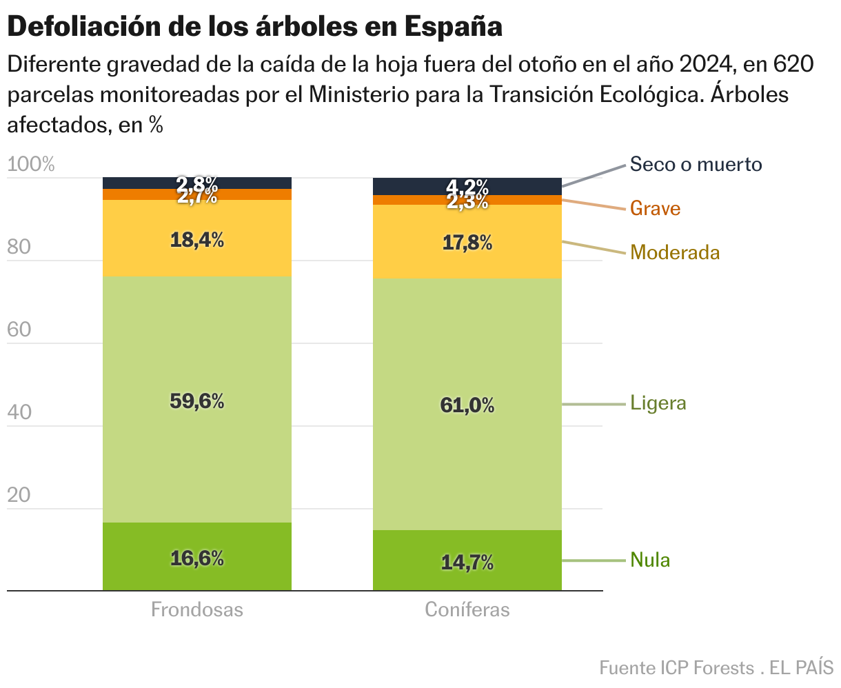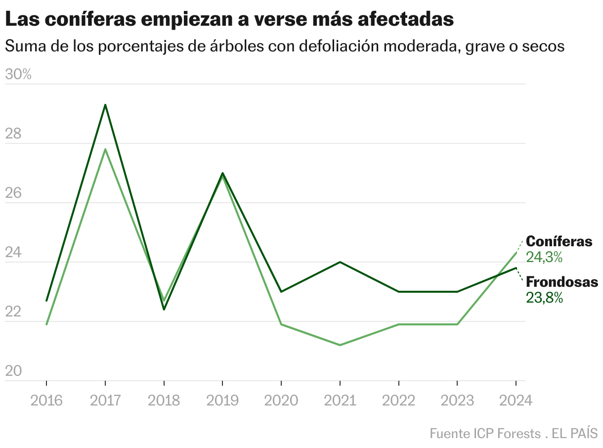 Existen diferentes iniciativas que monitorean la situación de las masas forestales del país. Las más amplias son las redes de seguimiento que lleva el Ministerio para la Transición Ecológica, dentro del programa ICP-Forest, un proyecto europeo puesto en marcha en 1985 como consecuencia de la gran alarma provocada en aquellos años por el deterioro de los bosques del norte del continente a causa de la lluvia ácida (problema en este caso originado por la contaminación atmosférica). El informe de 2024 de la denominada red de nivel I, señala que la mayoría de las especies arbóreas presentan defoliaciones medias “ligeras”, pero considera notable el número de variedades con una pérdida de hojas superior al 25% en su copa (en comparación con un ejemplar con un follaje ideal), entre ellas, las especies de carácter más mediterráneo como el alcornoque, la encina, el quejigo, el acebuche, el pino carrasco y la sabina albar. Este trabajo concluye también que la principal causa de este decaimiento es la sequía, seguido de los insectos. Y, a partir de estos mismos registros de la red de nivel I, el último dossier del ICP-Forest muestra unos gráficos de evolución desde 1990 que, en el caso de España, reflejan un cada vez mayor deterioro de los bosques por este proceso de defoliación.