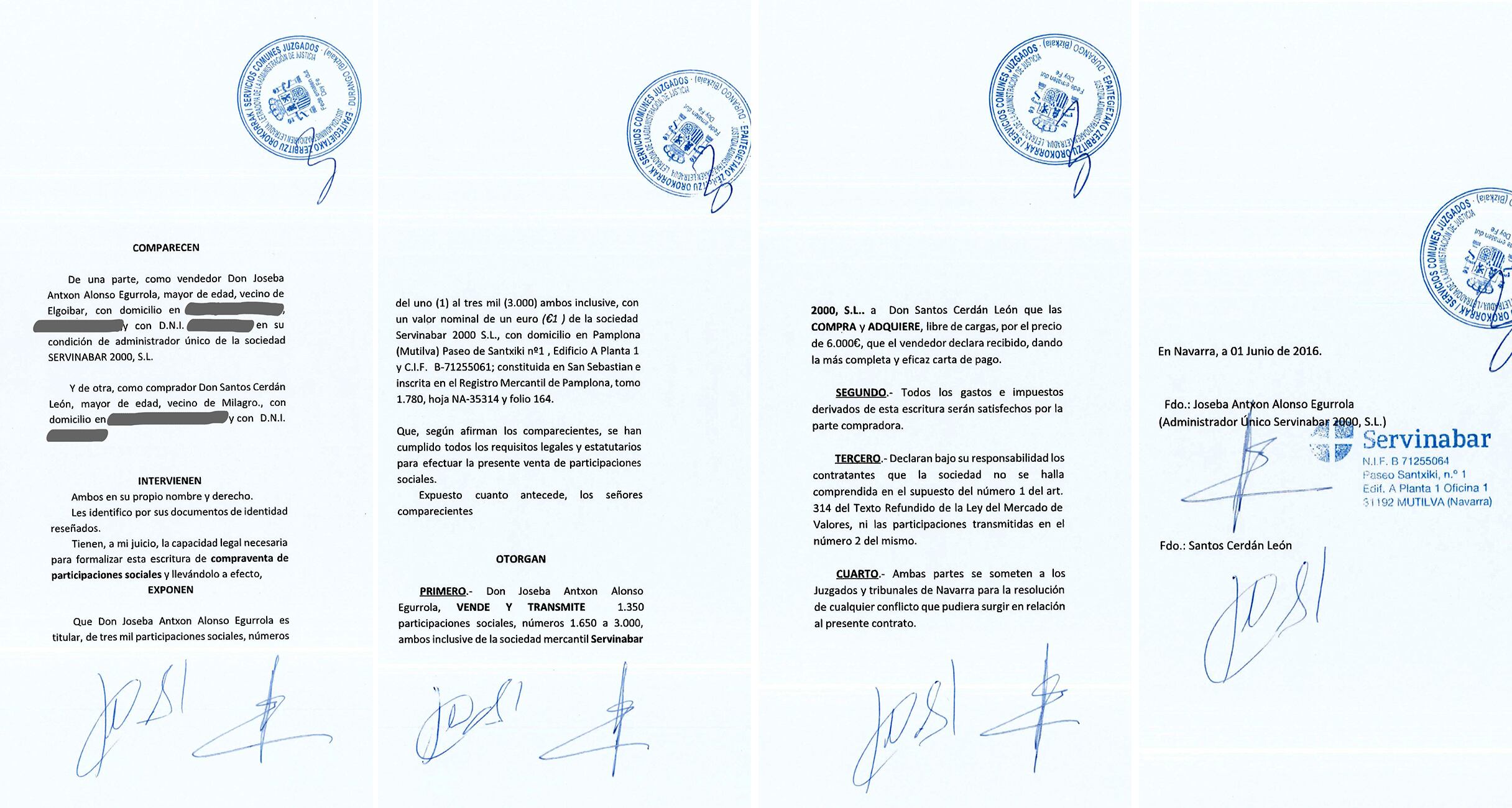 Santos Cerdán, exdiputado y ex secretario de Organización del PSOE, firmó el 1 de junio de 2016 un contrato privado con el empresario Joseba Antxon Alonso Egurrola por el que pactaba pagar 6.000 euros por el 45% de Servinabar 2000 SL, la sociedad navarra a la que la Guardia Civil considera una de las supuestas tapaderas de los inicios de la trama de corrupción en la que están presuntamente implicados tanto el exdirigente socialista como su antecesor en ese cargo y exministro de Transportes José Luis Ábalos y el que fuera su asesor, Koldo García. El precio está recogido en la copia del contrato de compraventa que la Unidad Central Operativa (UCO) de la Guardia Civil halló en el registro de la casa del empresario y que ha enviado al Tribunal Supremo.