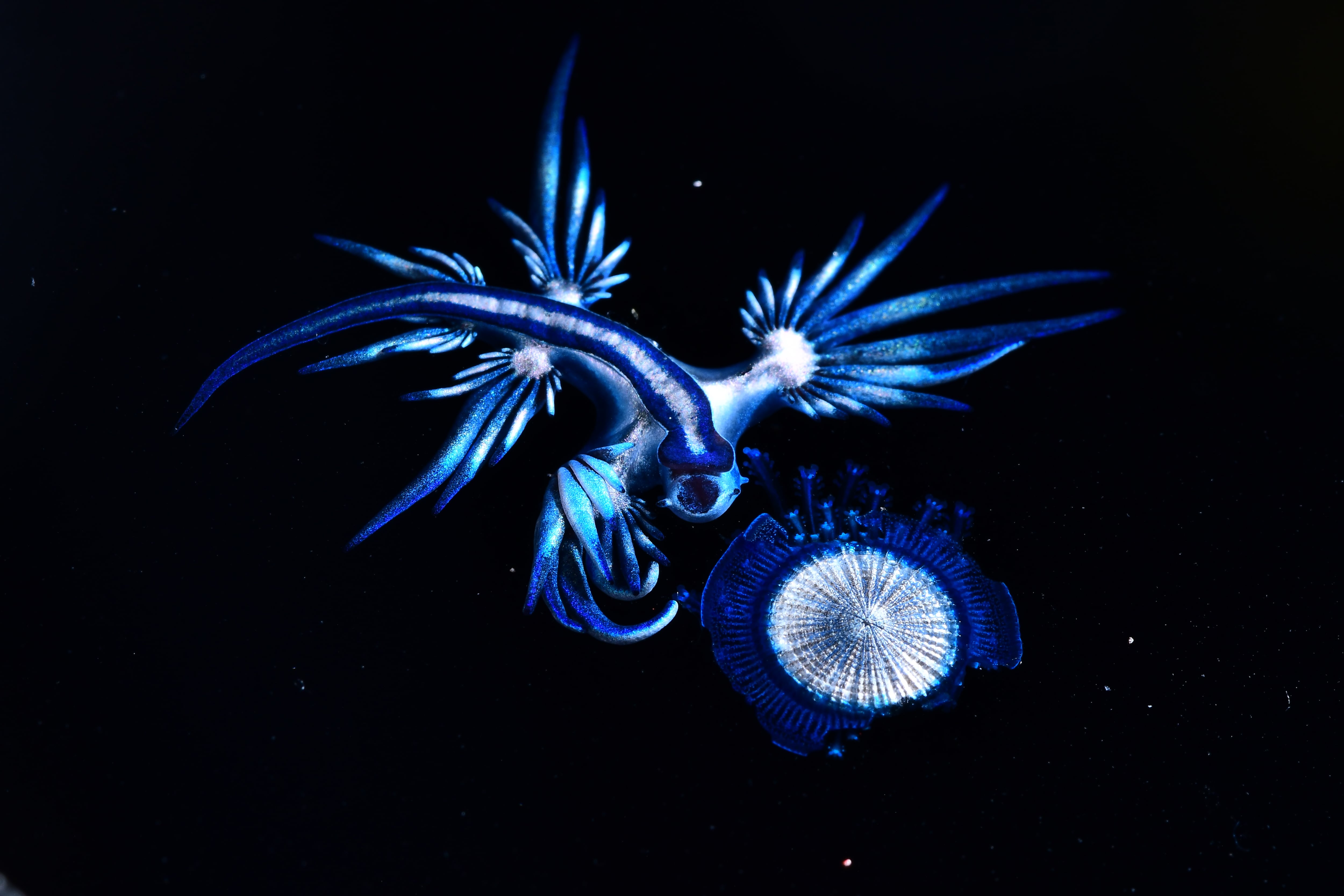 Desde los primeros registros históricos —como la mención de un “glaucínido” en 1705 bajo el nombre vernáculo Hirudinis marina en el Mediterráneo— hasta su descripción formal como Glaucus atlanticus en 1777 en el Atlántico, este pequeño “dragón azul” ha fascinado por su biología singular. Se trata de un nudibranquio pelágico que vive literalmente boca arriba: genera una burbuja de aire en su vientre que le permite flotar en la superficie, como si hiciera el muerto. El vientre, orientado hacia el cielo, es azul intenso-plateado y el dorso, que mira al fondo marino, es blanquecino. Hay un motivo. Esa inversión le hace confundirse desde arriba con el azul del océano y pasar desapercibido para las aves; y desde abajo, con la luz del cielo, reduciendo el riesgo de ser depredado por los peces. Su distribución es amplia en mares templados y tropicales del Atlántico, Índico y Pacífico, con apariciones ocasionales en el Mediterráneo arrastrado por corrientes superficiales.