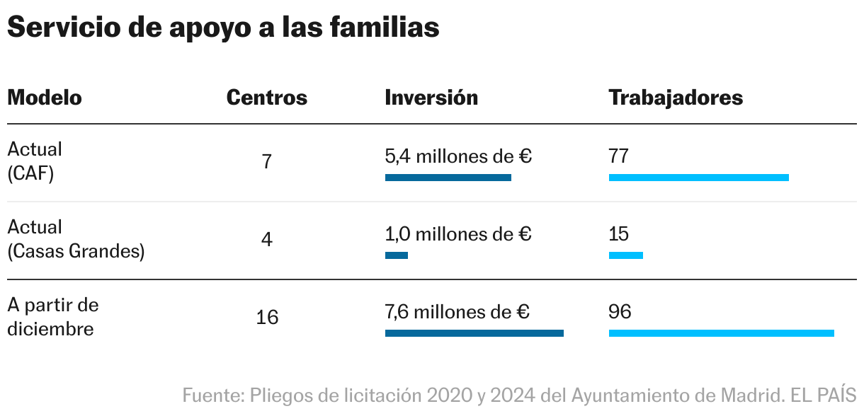 En junio, el Ayuntamiento de Madrid anunció un nuevo modelo en el que integraría las Casas Grandes en ocho Centros de Atención a las Familias (CAF), siete actuales y uno nuevo. Los CAF son otro servicio municipal que ofrece “apoyo a las familias para afrontar las dificultades que surgen en el desempeño de sus funciones parentales, prevención y atención en otros conflictos y crisis familiares, así como espacios de formación y fomento la participación comunitaria”, según describe el Consistorio en su página web. El nuevo contrato permitirá, según Cibeles, abrir otras nuevas cuatro Casas Grandes en Chamberí, Usera, Moratalaz y Latina y lograr una mejor conexión entre las distintas prestaciones de apoyo a la crianza “favoreciendo las posibles derivaciones y la coordinación entre profesionales”. Para todo, se destinarán 7,6 millones de euros para un contrato de dos años que empezará el 1 de diciembre de 2024.
