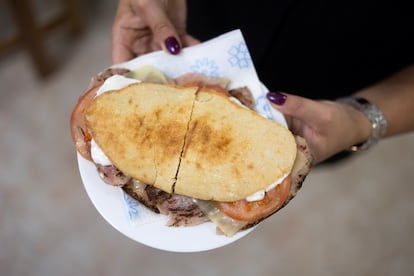 Los molletes de El Origen también son la base de los desayunos del Mesón El número uno, histórico negocio ubicado en el casco urbano de Antequera. Lo regenta la familia Toro desde los años 70. Primero de la mano de Pepe Toro, relacionado toda su vida con el fútbol —de ahí las múltiples fotografías del equipo local que pueblan las paredes— y al que aún se puede ver en las mesas echando un ojo a la contabilidad. Desde hace unos años su hijo, José Miguel Toro, de 49 años, está al frente. “Aquí nací y me crie”, subraya el hoy empresario. En su local se sirven cada mañana alrededor de un centenar de molletes. “Con chicharrones, zurrapa, aceite y tomate. Todo lo que le gusta a la gente del pueblo”, relata. Por encima de todos pone al mixto (4,50 euros, café incluido). “Lo tostamos solo por fuera, con un poquito de mantequilla por encima y orégano para que se vaya colando hacia el interior durante el tostado. Luego lo abrimos, le añadimos buen jamón de york y queso, que se funde con el calor. Y a disfrutar”, apunta Toro, quien reivindica el papel de este pan en el desayuno local igual que cualquier otro plato tradicional antequerano como el bienmesabe o la porra “que se puede pedir los 365 días del año”. Al mediodía, eso sí, también hay quien pide un buen bocata a base de lomo a la plancha.
