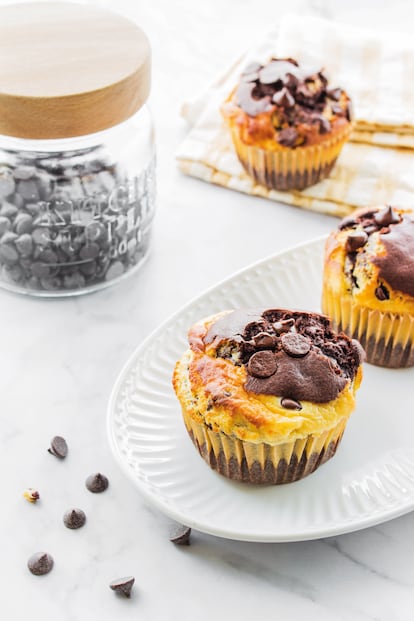 Colocar seis cápsulas para muffins en el interior de unas flaneras de metal (de este modo evitamos que se abran durante la cocción). Verter masa de chocolate hasta llenar ⅓ de cada cápsula y agregar por encima la preparación de queso. Por último, volver a verter el resto de masa de chocolate, con lo que se llenarán ¾ partes de las cápsulas con las masas. Esparcir el resto de chips de chocolate.