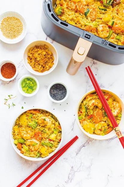 Incorporar el arroz cocido, mezclar con una cuchara de madera o silicona y programar la freidora a 200 °C durante cinco minutos.
