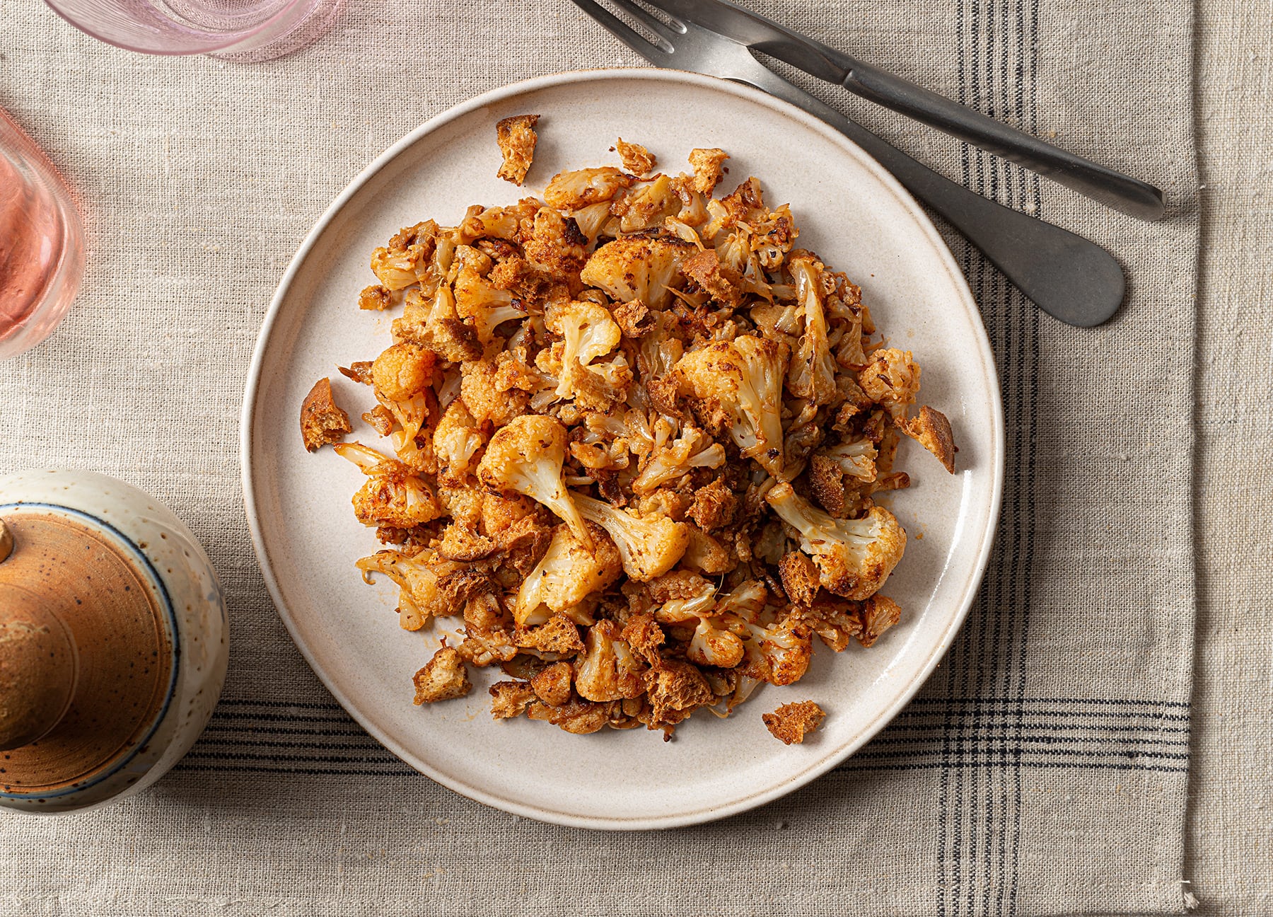 En la versión que hago en casa desde que descubrí esta fórmula tan placentera cocino previamente al vapor o al microondas la coliflor troceada, que luego salteo y troceo más menudamente con los condimentos; puedes cocer la coliflor, pero absorbe más agua que con los otros métodos y luego costará más que se retueste. Encuentro que el retostadito le aporta la mitad de la gracia a la coliflor, por ello es una receta ideal para introducir la coliflor a niños y otro personal que creen que esta hortaliza no les gusta. Se equivocan.