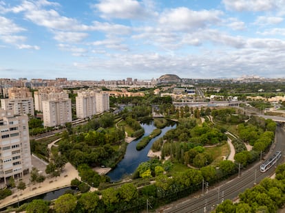En la periferia de la ciudad de Alicante, en el barrio de la playa de San Juan, un pato nada en un tranquilo estanque en el que se reflejan unos bloques de apartamentos contiguos. Los edificios se desintegran cuando el animal toca con el pico la lámina de agua. Las apariencias engañan, esta no es solo una zona verde para pasear con árboles y una laguna, sino el primer parque urbano inundable de España, La Marjal, un ingenioso ejemplo de adaptación a lluvias torrenciales, otro de los grandes peligros para el país derivados del cambio climático. Promovido conjuntamente por el Ayuntamiento y la empresa Aguas de Alicante, lleva funcionando 10 años. “Aquí se iba a construir un depósito de hormigón para acumular agua en caso de fuertes precipitaciones, pero en lugar de eso optamos por una solución basada en la naturaleza inspirándonos en los marjales”, afirma Carlos Domínguez, ingeniero agrónomo y responsable de Parques y Jardines del Ayuntamiento de Alicante, que participó desde el principio en su diseño y del que ahora depende su mantenimiento. Igual que los marjales son unos valiosos ecosistemas que pueden estar cubiertos de agua de forma intermitente, este parque está preparado para inundarse cuando haga falta, pudiendo acumular hasta 45.000 metros cúbicos de lluvia, tanto como unas 16 piscinas olímpicas.