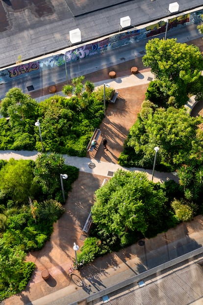 Otras urbes como Vitoria o Bilbao cuentan también con planes de adaptación al calentamiento del planeta, pero en pocos lugares está más presente la urgencia del cambio que en Barcelona, por la gravedad de las últimas sequías. Lo sabe bien Adrià Farrero, técnico de Parques y Jardines del Ayuntamiento, que en la emergencia de hace dos años vivió cómo se llegaba al punto de restringir por completo el riego en la ciudad, permitiéndose solo mínimas aportaciones de agua de supervivencia para evitar la muerte de los árboles: “Fue un dolor de cabeza, un desastre, resulta muy estresante no poder regar para los que tenemos que mantener vivos los jardines”. Se perdieron casi 4.000 árboles, pero se salvaron muchos más. El reto es seguir preparándose para resistir mejor la próxima sequía. En Cristóbal de Moura se quitaron carriles para los coches, se retiró el asfalto y ahora gran parte de la calle está formada por tierra vegetal donde crece una vegetación exuberante. El resultado son los SUD, sistemas urbanos de drenaje, una de las innovaciones más interesantes en adaptación en ciudades. Como detalla Farrero, la idea es que la lluvia no resbale por las calles hasta encontrar un sumidero (lo que en las urbes a veces satura el alcantarillado causando inundaciones o vertidos sin depurar), sino que se infiltre en la tierra, sirviendo de riego para las plantas y ayudando a recargar las capas freáticas de las que toma cada vez más agua Barcelona.