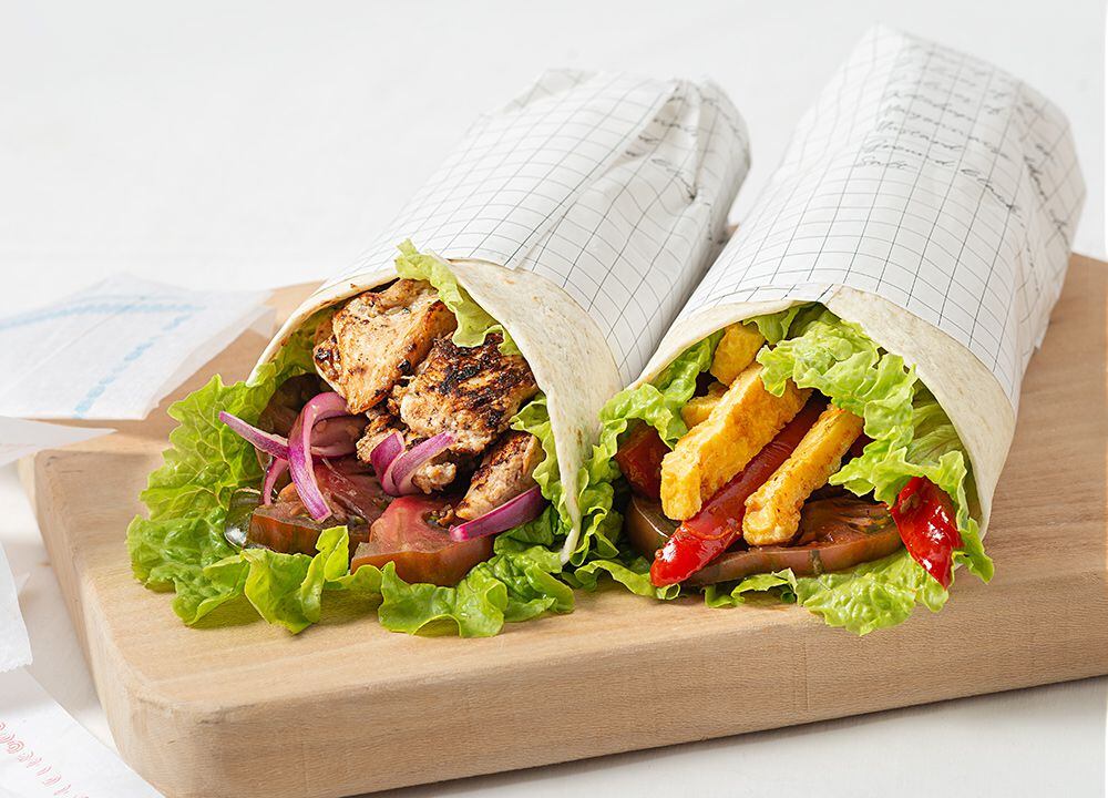 Las carnes se suelen macerar en yogur, tomate y especias; en este caso el pollo queda tiernísimo y jugosón por el adobado y el salteado rápido. Esta sencillísima fórmula de dúrum de pollo la adaptamos a un relleno vegetariano, en el que puedes sustituir la carne prácticamente por lo que te dé la gana, desde verduras al horno a una tortilla francesa en tiras, legumbres cocidas, tofu, setas variadas, etc. No te olvides de que los dúrums son un invento fantástico para aprovechar restos, como los de un pollo asado. Si quieres, puedes servirlos con alguna salsa de yogur –aquí tienes una buena sugerencia–, pero no es obligatorio.