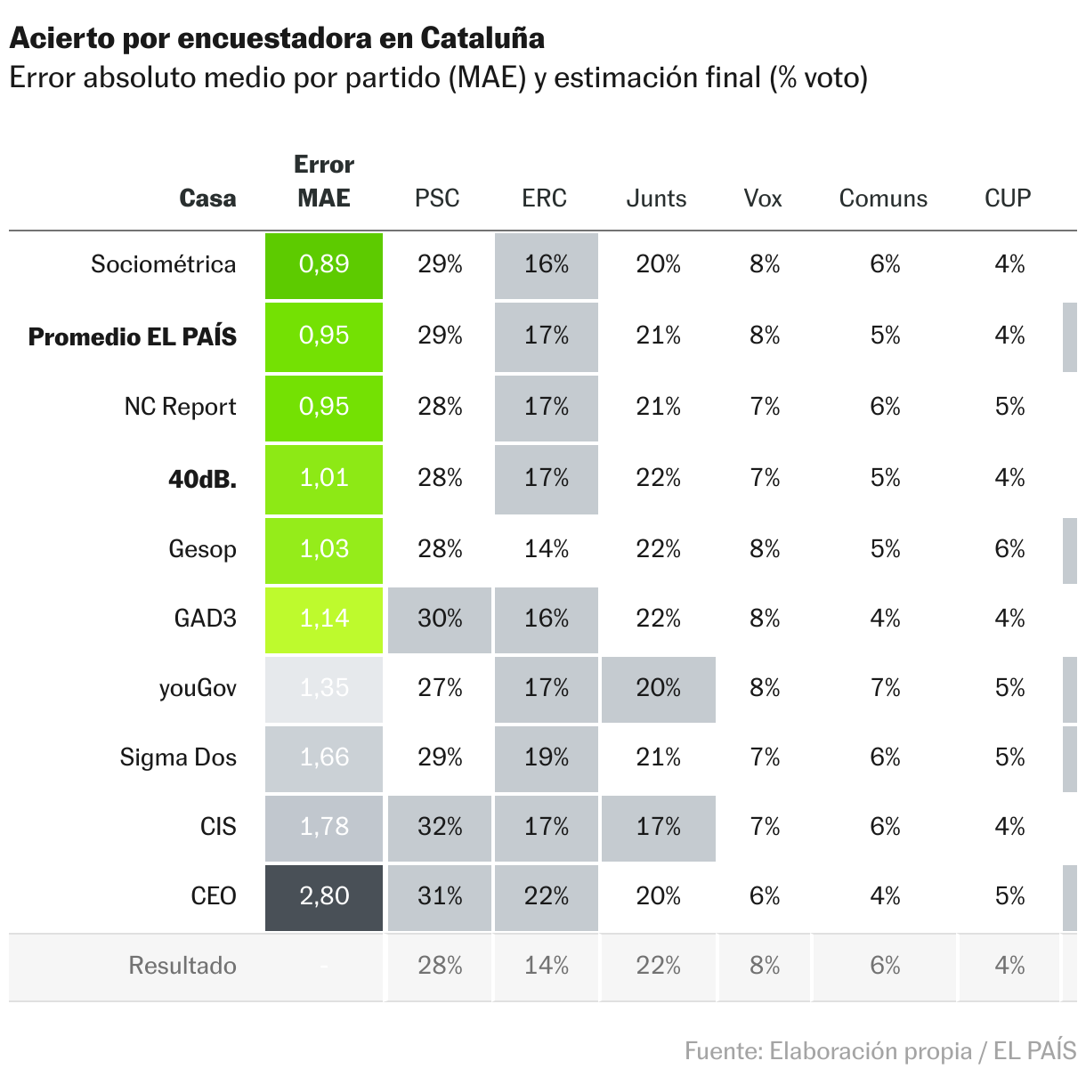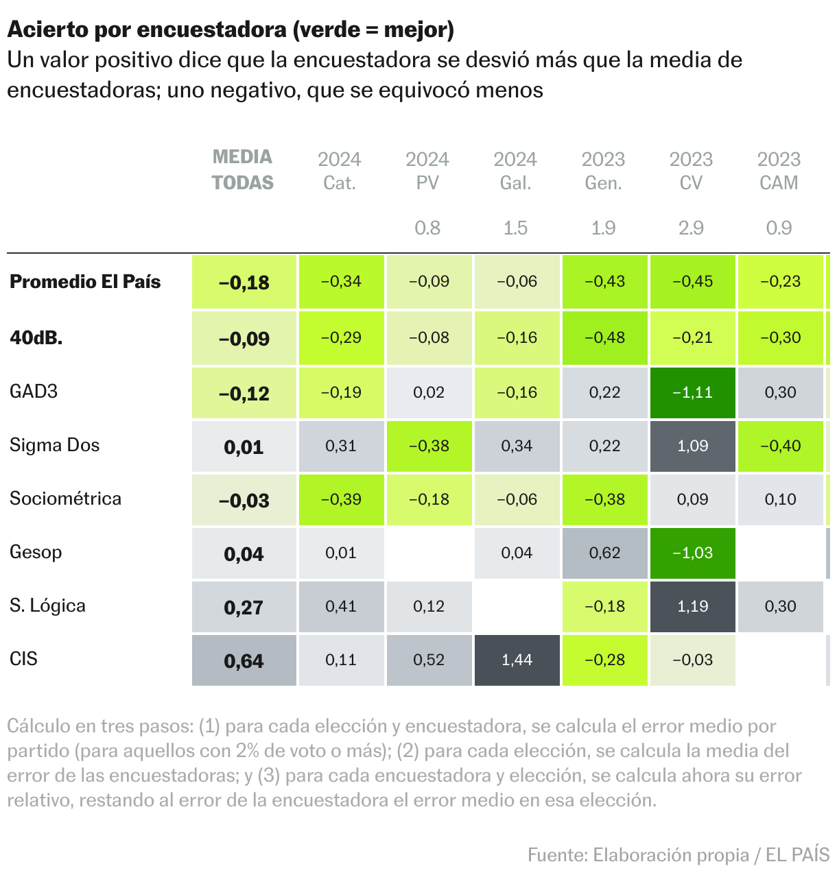 ¿Qué sondeos están siendo más precisos? En la tabla se representa el acierto de siete empresas y del CIS, en las principales citas electorales desde 2015. Ahí se puede comprobar el buen desempeño tanto de los sondeos de 40dB. como del promedio de EL PAÍS.