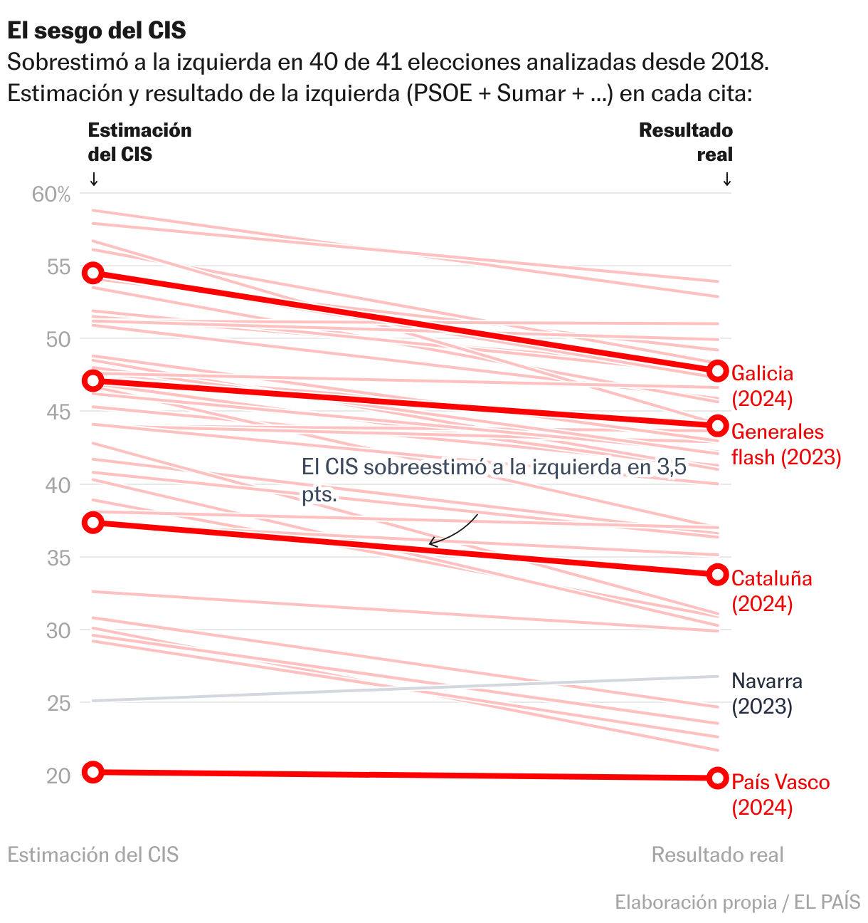 El CIS también volvió a exhibir su principal deficiencia: el sesgo a la izquierda de sus estimaciones. Le daba un 37,4% a la suma de PSC y Comuns, que se quedaron en el 33,8%. Tampoco sorprende. Ese patrón se repite sin casi excepciones: con Tezanos, sobrestimó a la izquierda en 40 de las 41 elecciones analizadas.